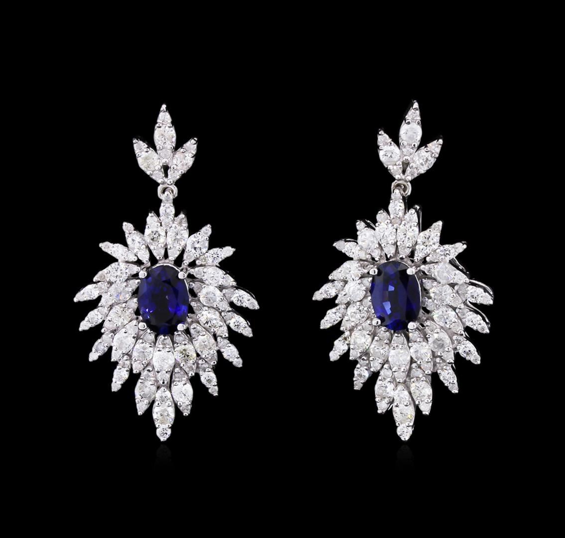 One pair electronically tested 14KT white gold ladies combination cast & assembled sapphire and diamond earrings with friction posts with a bright polish finish. Identified with markings of "585". Condition is new. Containing: Two prong set oval modified brilliant cut natural blue sapphires, measuring 6.94 x 5.05 x 3.17mm, approximate total weight of 1.86ct., clarity is eye clean, type II, medium light, moderately strong, blue color, (GIA B 4/4), cut is good. Thirty-Two prong set round brilliant cut diamonds, measuring 2.00 - 2.00 x 1.20mm (depth est.) approximate total weight of 32 Stones = 0.93ct. Clarity: I-1. Color: I - J, Cut is Good. Sixty-Four prong set round brilliant cut diamonds, measuring 1.50 - 1.50 x 0.90mm (depth est.) approximate total weight of 64 Stones = 0.79ct. Clarity: SI-2 to I-1. Color: I - J, Cut is Good. All diamonds are graded in the mounting, unless otherwise stated. Total Weight of Colored Stones 1.86ct. Total Weight of Diamonds 1.72ct. Total Weight of Earrings 9.50 grams. GGL Appraised at $6,870.00.