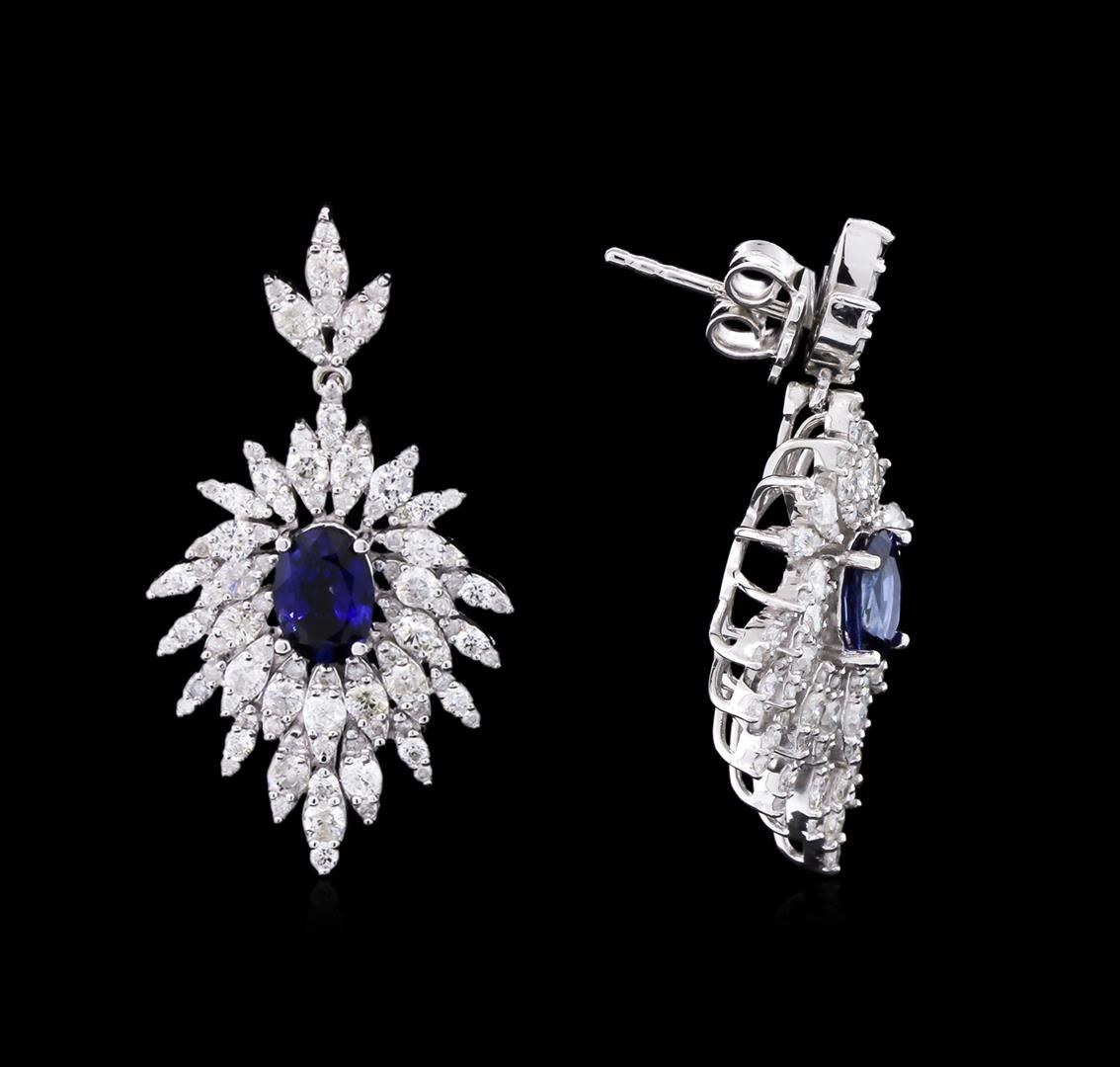 One pair electronically tested 14KT white gold ladies combination cast & assembled sapphire and diamond earrings with friction posts with a bright polish finish. Identified with markings of "585". Condition is new. Containing: Two prong set oval modified brilliant cut natural blue sapphires, measuring 6.94 x 5.05 x 3.17mm, approximate total weight of 1.86ct., clarity is eye clean, type II, medium light, moderately strong, blue color, (GIA B 4/4), cut is good. Thirty-Two prong set round brilliant cut diamonds, measuring 2.00 - 2.00 x 1.20mm (depth est.) approximate total weight of 32 Stones = 0.93ct. Clarity: I-1. Color: I - J, Cut is Good. Sixty-Four prong set round brilliant cut diamonds, measuring 1.50 - 1.50 x 0.90mm (depth est.) approximate total weight of 64 Stones = 0.79ct. Clarity: SI-2 to I-1. Color: I - J, Cut is Good. All diamonds are graded in the mounting, unless otherwise stated. Total Weight of Colored Stones 1.86ct. Total Weight of Diamonds 1.72ct. Total Weight of Earrings 9.50 grams. GGL Appraised at $6,870.00.