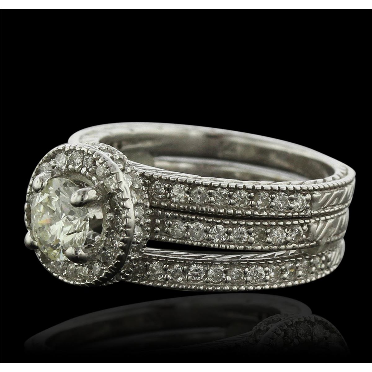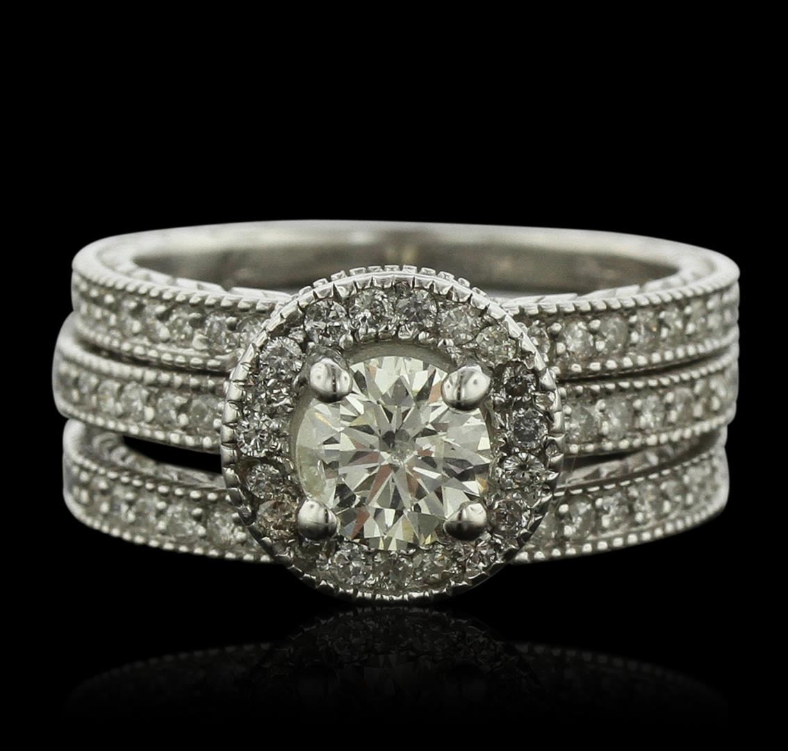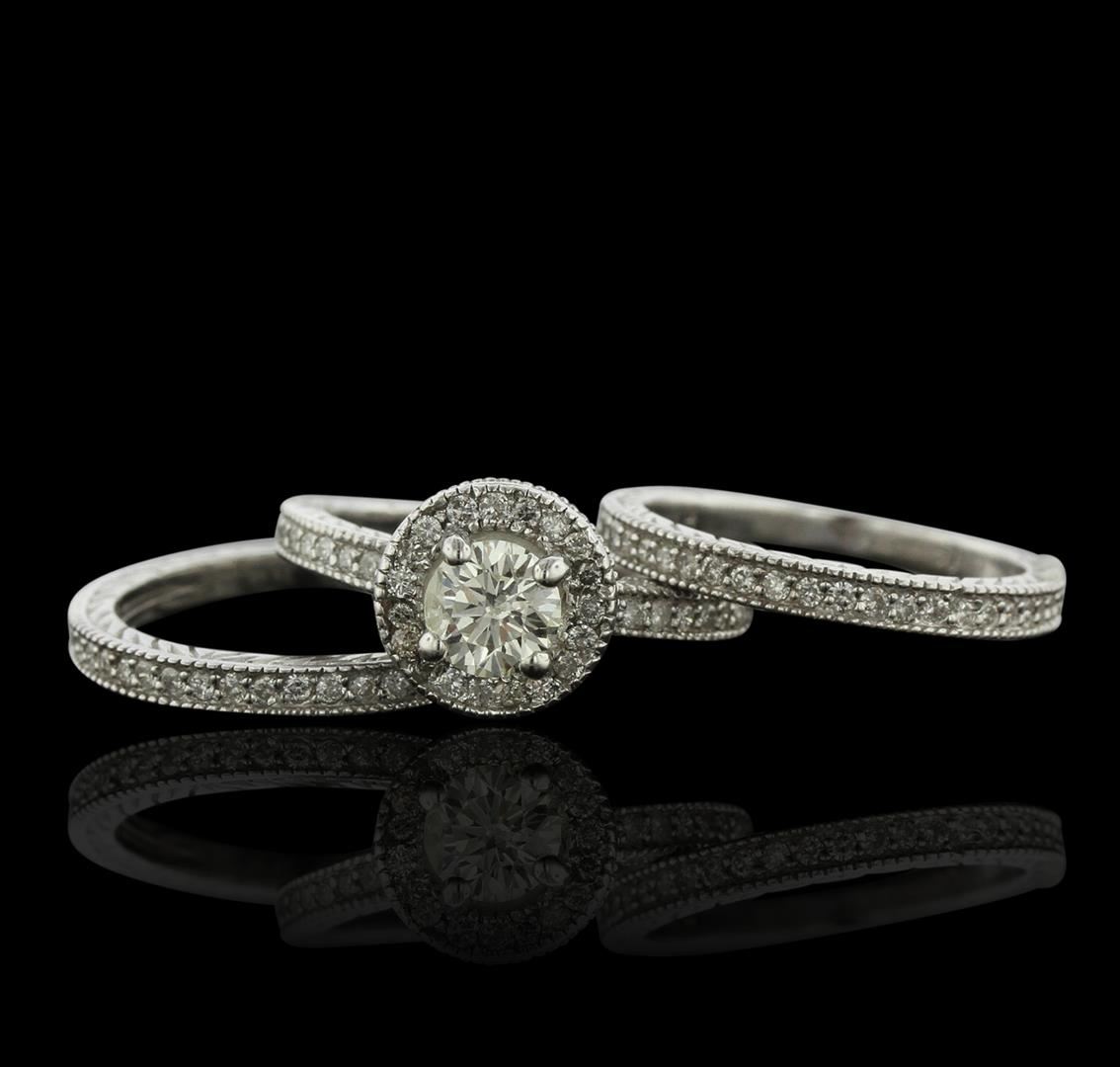 One electronically tested 14KT White Gold ladies cast and assembled diamond wedding set. Condition is new, good workmanship. The wedding set includes a diamond engagement ring and two matching diamond wedding bands. The engagement ring features a diamond set within a diamond bezel and supported by a diamond set under gallery and shoulders. The set is completed by two matching diamond wedding bands. Each ring is completed by a two millimeter wide patterned band. Bright polish finish with milgrain detailing throughout. Identified with markings of "14K". Containing: One prong set round brilliant cut diamond, measuring 5.75 -5.74 x 3.50mm (depth est) approximate weight of 0.80ct with a medium blue fluorescence. Graded in the setting. Clarity I-1 Color K Depth 60.9% Table 59.1%. Ninety-seven bead and prong set round brilliant cut diamonds, measuring 1.50 - 1.30 x 0.84mm (depth est) approximate total weight of 97 stones = 1.07ct. The color grade reflects the entire range of color for this group. Graded in the setting. Clarity SI-1 to I-1. Color G-J. Total weight of diamonds 1.87ct. Total weight of wedding set 8.81 grams. AIG Appraised at $10,355.00.