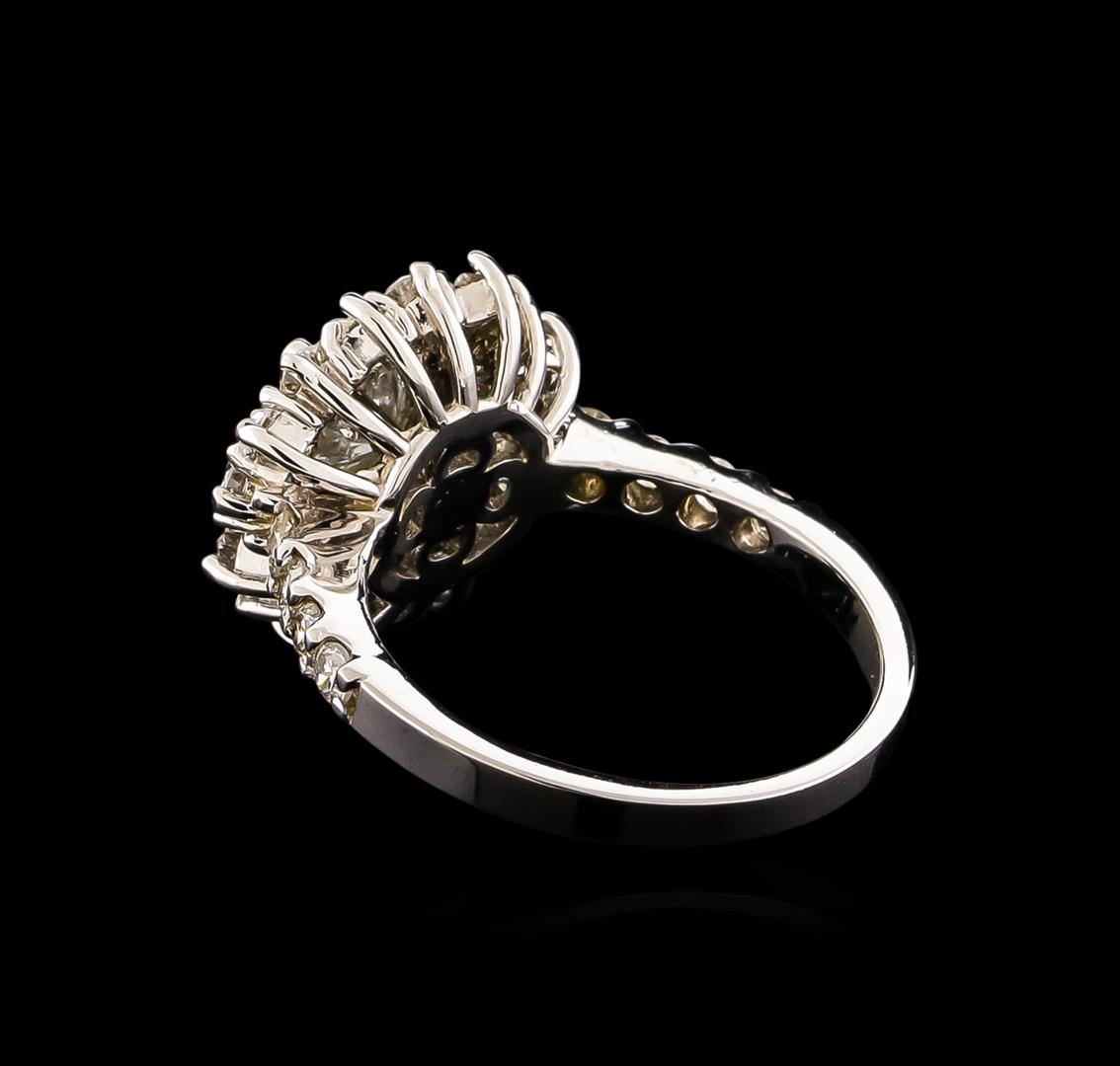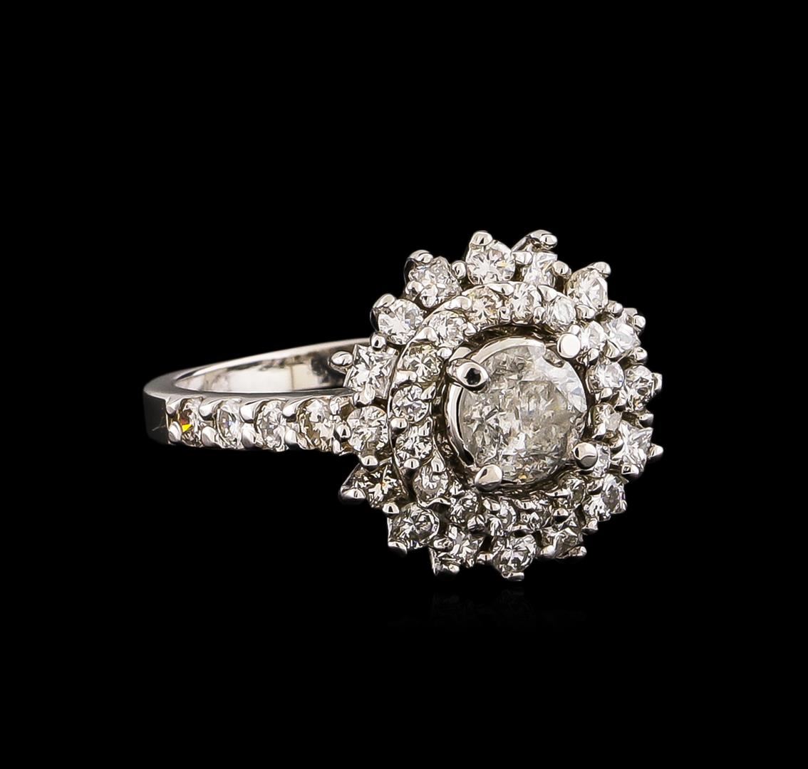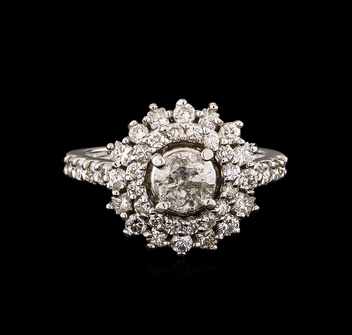 One electronically tested 14KT white gold ladies cast diamond ring with a bright polish finish. Condition is new, good workmanship. The featured diamond is set within a two tiered diamond bezel supported by diamond set shoulders, completed by a two millimeter wide band. Identified with markings of "K14". Containing: One prong set round brilliant cut diamond, measuring 5.60 - 5.50 x 3.35mm (depth est.), 10.00.%. GTCF approximate weight of 0.77ct with a strong blue fluorescence. Naturally occurring internal & external characteristics are present, including iridescence. Graded in the setting. Clarity: I-2. Color: 60.4%. Table 61.3%. Forty prong set round brilliant and princess cut diamonds approximate. Total Weight of 40 Stones = 1.10ct. Graded in the setting. Clarity: SI-1 to I-1. Color: H - J. Total Weight of Diamonds 1.87ct. Total Weight of Ring 4.59 grams. AIG Appraised at $7,690.00.