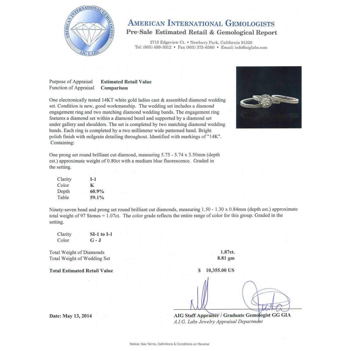 One electronically tested 14KT White Gold ladies cast and assembled diamond wedding set. Condition is new, good workmanship. The wedding set includes a diamond engagement ring and two matching diamond wedding bands. The engagement ring features a diamond set within a diamond bezel and supported by a diamond set under gallery and shoulders. The set is completed by two matching diamond wedding bands. Each ring is completed by a two millimeter wide patterned band. Bright polish finish with milgrain detailing throughout. Identified with markings of "14K". Containing: One prong set round brilliant cut diamond, measuring 5.75 -5.74 x 3.50mm (depth est) approximate weight of 0.80ct with a medium blue fluorescence. Graded in the setting. Clarity I-1 Color K Depth 60.9% Table 59.1%. Ninety-seven bead and prong set round brilliant cut diamonds, measuring 1.50 - 1.30 x 0.84mm (depth est) approximate total weight of 97 stones = 1.07ct. The color grade reflects the entire range of color for this group. Graded in the setting. Clarity SI-1 to I-1. Color G-J. Total weight of diamonds 1.87ct. Total weight of wedding set 8.81 grams. AIG Appraised at $10,355.00.