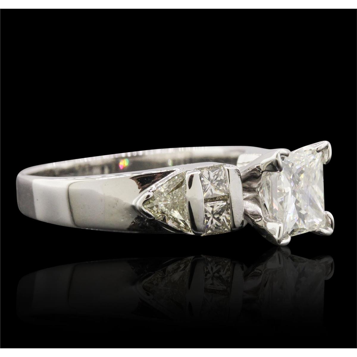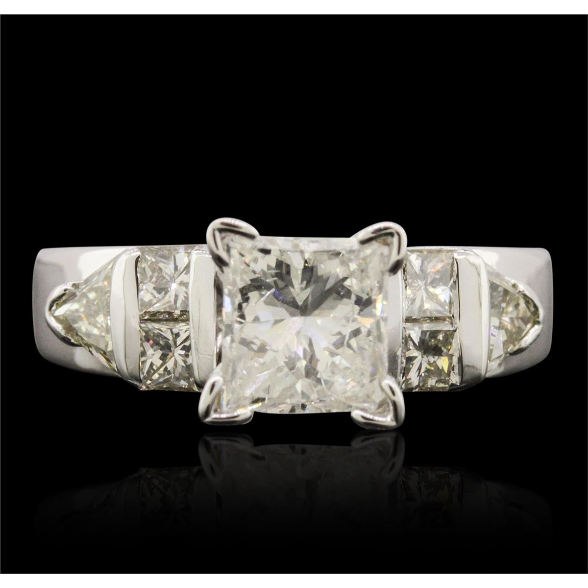 One electronically tested 14KT white gold ladies combination cast & assembled engagement ring with a bright polish finish. Condition is very good. Identified with markings of "14KP". Containing: One prong set princess cut diamond, measuring 6.00 x 5.50 x 4.13mm (depth est.) approximate weight of 1.12ct. Clarity: SI-2. Color: J, Cut is Good. Clarity: the stone has been enhanced. Four channel set princess cut diamonds, measuring 2.30 x 2.30 x 1.73mm (depth est.) approximate. Total Weight of 4 Stones = 0.30ct. Clarity: VS-2. Color: L - M, Cut is Good. Two prong set triangle brilliant cut diamonds, measuring 4.00 x 4.00 x 2.48mm (depth est.) approximate. Total Weight of 2 Stones = 0.45ct. Clarity: SI-2. Color: L - M, Cut is Good. All diamonds are graded in the mounting, unless otherwise stated. Total Weight of Diamonds 1.87ct. Total Weight of Ring 4.30 grams. GGL Appraised at $15,675.00.