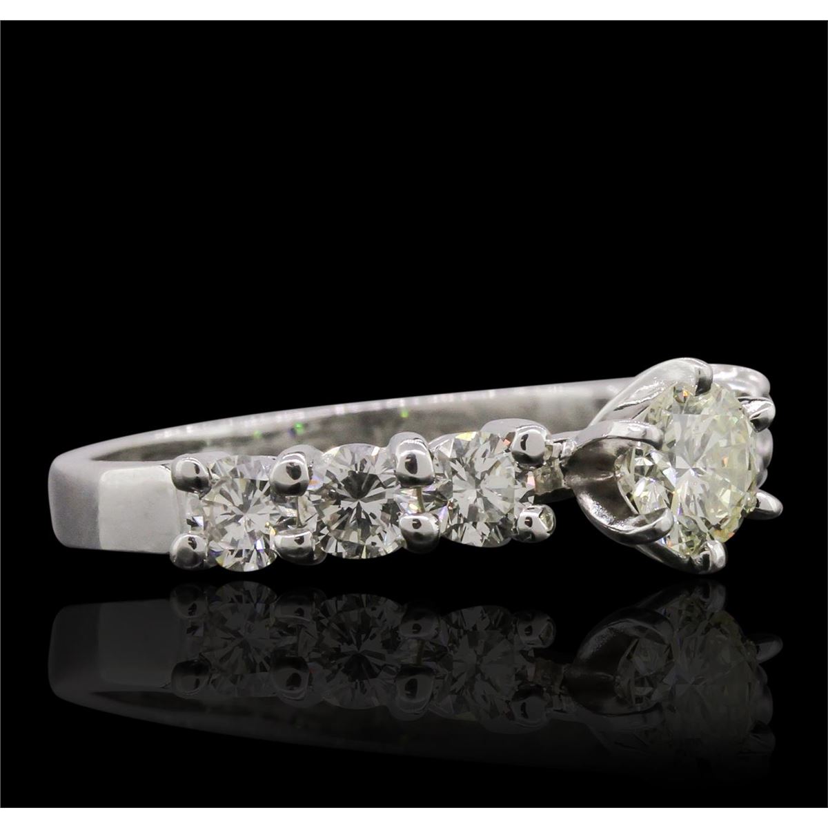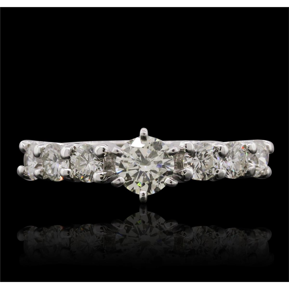One electronically tested 14KT white gold ladies cast & assembled diamond unity ring with a bright polish finish. Condition is new, good workmanship. The featured diamond is supported by diamond set shoulders, completed by a two and one-half millimeter wide band. Identified with markings of "14K". Containing: One prong set round brilliant cut diamond, measuring 5.45 - 5.40 x 3.50mm (depth est.) approximate weight of 0.72ct with a medium blue fluorescence. Graded in the setting. Clarity: SI-1. Depth: 64.5%. Table 62.6%. Six prong set round brilliant cut diamonds, measuring 3.65 - 3.60 x 2.18mm (depth est.) approximate. Total Weight of 6 Stones = 1.15ct. Graded in the setting. Clarity: VS-2 to SI-1. Color: H - J. Total Weight of Diamonds 1.87ct. Total Weight of Ring 4.00 grams. AIG Appraised at $10,680.00.