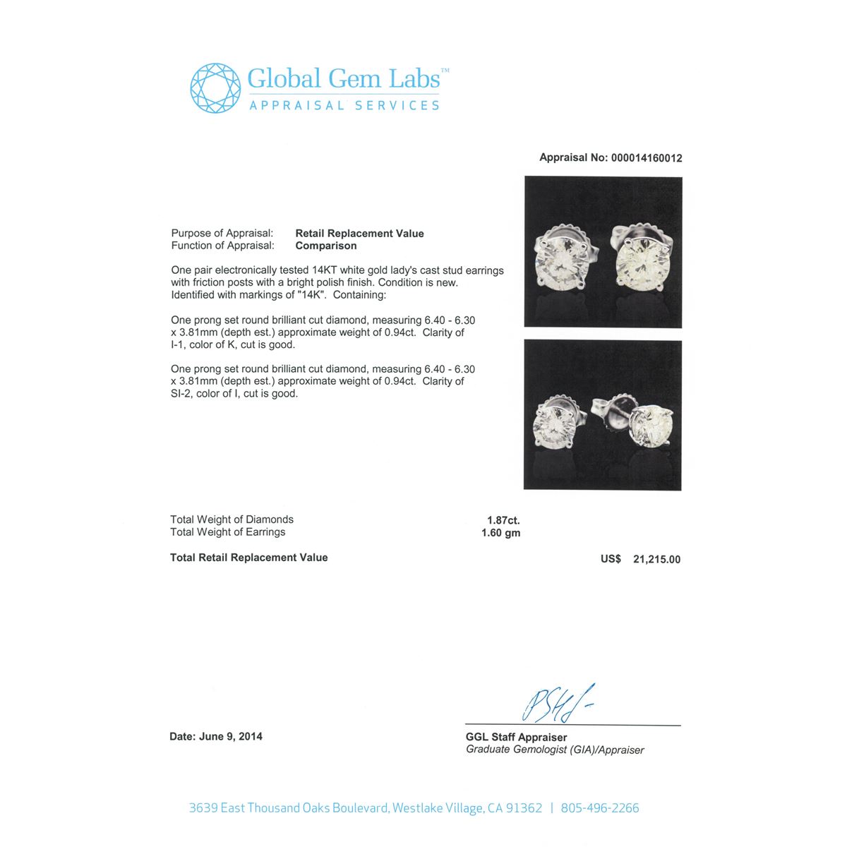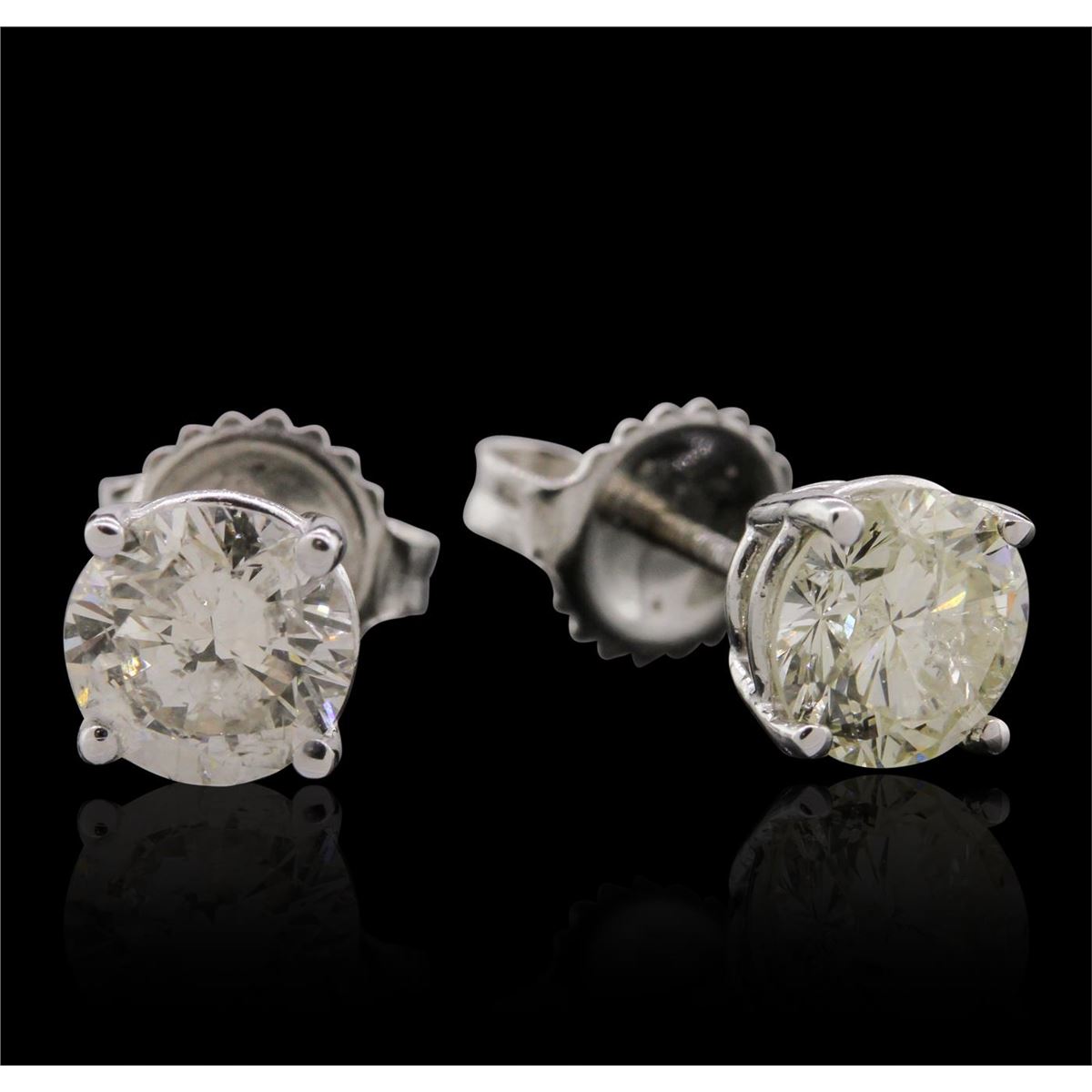 One pair electronically tested 14KT white gold Ladies cast stud earrings with friction posts with a bright polish finish. Condition is new. Identified with markings of "14K". Containing: One prong set round brilliant cut diamond, measuring 6.40 - 6.30 x 3.81mm (depth est.) approximate weight of 0.94ct. Clarity: I-1. Color: K, Cut is Good. One prong set round brilliant cut diamond, measuring 6.40 - 6.30 x 3.81mm (depth est.) approximate weight of 0.94ct. Clarity: SI-2. Color: I, Cut is Good. Total Weight of Diamonds 1.87ct. Total Weight of Earrings 1.60 grams. GGL Appraised at $21,215.00.