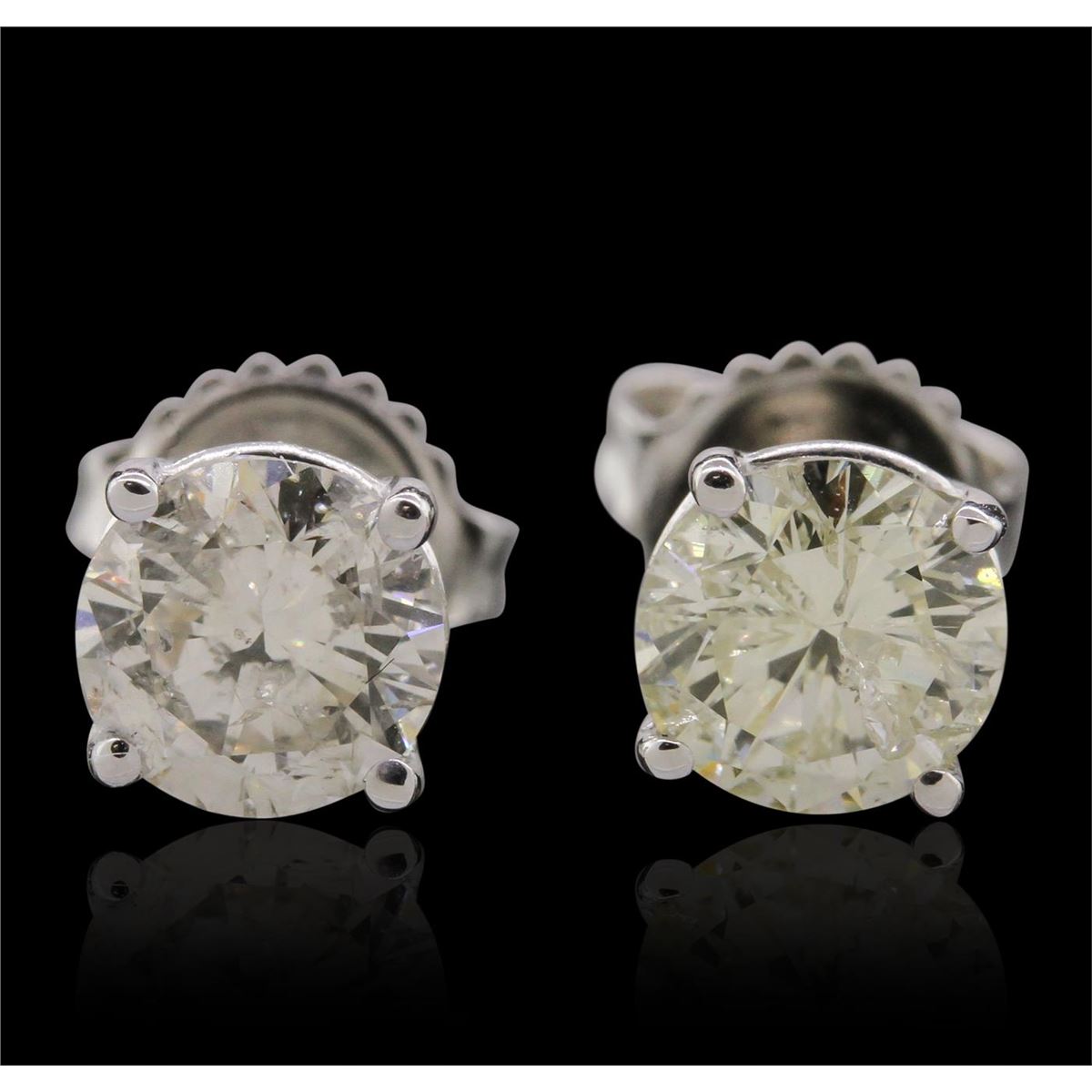 One pair electronically tested 14KT white gold Ladies cast stud earrings with friction posts with a bright polish finish. Condition is new. Identified with markings of "14K". Containing: One prong set round brilliant cut diamond, measuring 6.40 - 6.30 x 3.81mm (depth est.) approximate weight of 0.94ct. Clarity: I-1. Color: K, Cut is Good. One prong set round brilliant cut diamond, measuring 6.40 - 6.30 x 3.81mm (depth est.) approximate weight of 0.94ct. Clarity: SI-2. Color: I, Cut is Good. Total Weight of Diamonds 1.87ct. Total Weight of Earrings 1.60 grams. GGL Appraised at $21,215.00.