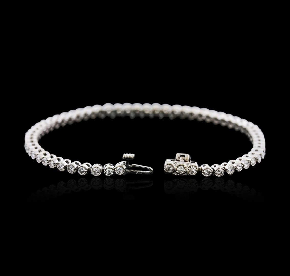 One electronically tested 14KT white gold ladies cast diamond tennis bracelet with a hidden box clasp with safety closer with a bright polish finish. Measurements: 7" in length Identified with markings of "14K". Condition is new. Containing: Sixty-Four prong set round brilliant cut diamonds, measuring 2.00 - 2.00 x 1.20mm (depth est.) approximate total weight of 64 Stones = 1.87ct. Clarity: SI-1 to SI-2. Color: H - I, Cut is Good. All diamonds are graded in the mounting, unless otherwise stated. Total Weight of Diamonds 1.87ct. Total Weight of Tennis Bracelet 9.80 grams. GGL Appraised at $5,875.00.