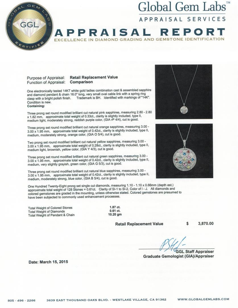 One electronically tested 14KT white gold ladies combination cast & assembled sapphire and diamond pendant & chain 16.0" long, very small oval cable link with a spring ring clasp with a bright polish finish. Trademark is BH. Identified with markings of "14K". Condition is new. Containing: Three prong set round modified brilliant cut natural pink sapphires, measuring 2.80 - 2.80 x 1.82 mm, approximate total weight of 0.33ct., clarity is slightly included, type II, medium light, moderately strong, reddish purple color, (GIA rP 4/4), cut is good. Three prong set round modified brilliant cut natural orange sapphires, measuring 3.00 - 3.00 x 1.95 mm, approximate total weight of 0.42ct., clarity is slightly included, type II, medium, moderately strong, orange color, (GIA O 5/4), cut is good. Two prong set round modified brilliant cut natural yellow sapphires, measuring 3.00 - 3.00 x 1.95 mm, approximate total weight of 0.28ct., clarity is slightly included, type II, medium light, brownish, yellow color, (GIA Y 4/3), cut is good. Three prong set round modified brilliant cut natural green sapphires, measuring 3.00 - 3.00 x 1.95 mm, approximate total weight of 0.42ct., clarity is slightly included, type II, medium, very slightly grayish, green color, (GIA G 5/3), cut is good. Three prong set round modified brilliant cut natural blue sapphires, measuring 3.00 - 3.00 x 1.95 mm, approximate total weight of 0.42ct., clarity is slightly included, type II, medium, moderately strong, blue color, (GIA B 5/4), cut is good. One Hundred Twenty-Eight prong set single cut diamonds, measuring 1.10 - 1.10 x 0.66mm (depth est.) approximate total weight of 128 Stones = 0.61ct. Clarity of SI-1 to SI-2, Color of I - J. All diamonds and colored gemstones are graded in the mounting, unless otherwise stated. Colored gemstones are presumed to have been subjected to commonly used enhancement processes. Total Weight of Colored Stones 1.87ct. Total Weight of Diamonds 0.61ct. Total Weight of Pendant & Chain 10.20 grams. GGL Appraised at $3,870.00.