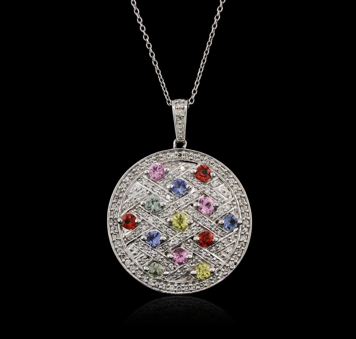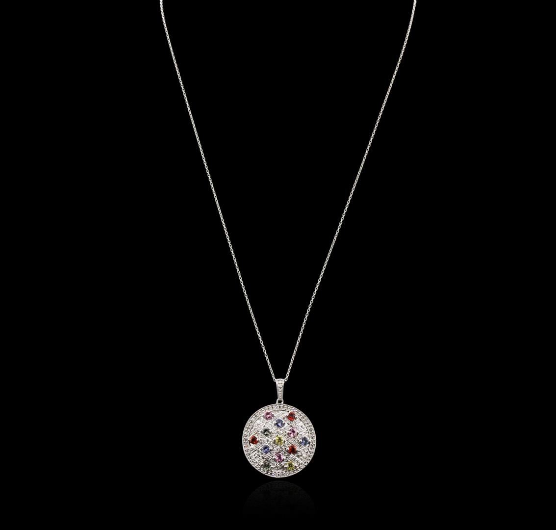 One electronically tested 14KT white gold ladies combination cast & assembled sapphire and diamond pendant & chain 16.0" long, very small oval cable link with a spring ring clasp with a bright polish finish. Trademark is BH. Identified with markings of "14K". Condition is new. Containing: Three prong set round modified brilliant cut natural pink sapphires, measuring 2.80 - 2.80 x 1.82 mm, approximate total weight of 0.33ct., clarity is slightly included, type II, medium light, moderately strong, reddish purple color, (GIA rP 4/4), cut is good. Three prong set round modified brilliant cut natural orange sapphires, measuring 3.00 - 3.00 x 1.95 mm, approximate total weight of 0.42ct., clarity is slightly included, type II, medium, moderately strong, orange color, (GIA O 5/4), cut is good. Two prong set round modified brilliant cut natural yellow sapphires, measuring 3.00 - 3.00 x 1.95 mm, approximate total weight of 0.28ct., clarity is slightly included, type II, medium light, brownish, yellow color, (GIA Y 4/3), cut is good. Three prong set round modified brilliant cut natural green sapphires, measuring 3.00 - 3.00 x 1.95 mm, approximate total weight of 0.42ct., clarity is slightly included, type II, medium, very slightly grayish, green color, (GIA G 5/3), cut is good. Three prong set round modified brilliant cut natural blue sapphires, measuring 3.00 - 3.00 x 1.95 mm, approximate total weight of 0.42ct., clarity is slightly included, type II, medium, moderately strong, blue color, (GIA B 5/4), cut is good. One Hundred Twenty-Eight prong set single cut diamonds, measuring 1.10 - 1.10 x 0.66mm (depth est.) approximate total weight of 128 Stones = 0.61ct. Clarity of SI-1 to SI-2, Color of I - J. All diamonds and colored gemstones are graded in the mounting, unless otherwise stated. Colored gemstones are presumed to have been subjected to commonly used enhancement processes. Total Weight of Colored Stones 1.87ct. Total Weight of Diamonds 0.61ct. Total Weight of Pendant & Chain 10.20 grams. GGL Appraised at $3,870.00.