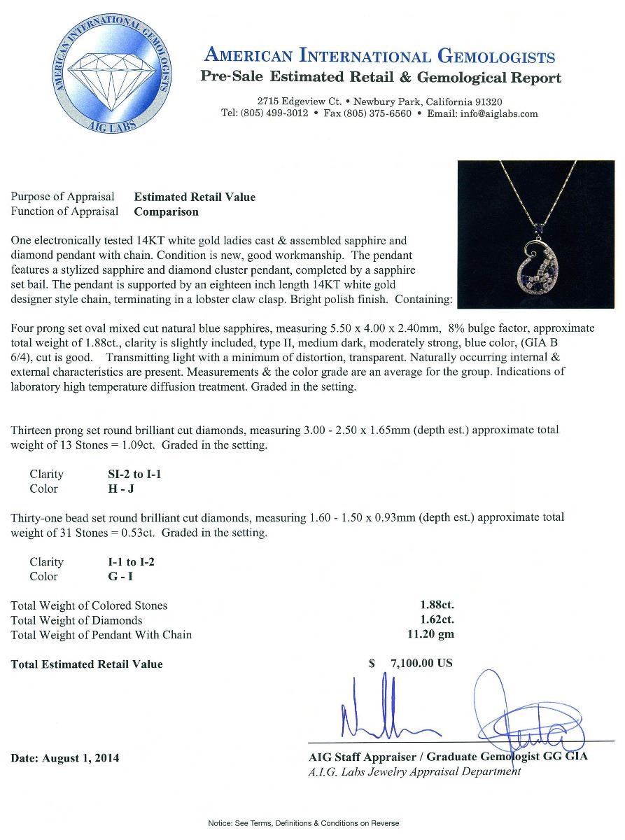 One electronically tested 14KT white gold ladies cast & assembled sapphire and diamond pendant with chain. Condition is new, good workmanship. The pendant features a stylized sapphire and diamond cluster pendant, completed by a sapphire set bail. The pendant is supported by an eighteen inch length 14KT white gold designer style chain, terminating in a lobster claw clasp. Bright polish finish. Containing: Four prong set oval mixed cut natural blue sapphires, measuring 5.50 x 4.00 x 2.40mm, 8%. bulge factor, approximate. Total Weight of 1.88ct., clarity is slightly included, type II, medium dark, moderately strong, blue color, (GIA B 6/4), cut is good. Transmitting light with a minimum of distortion, transparent. Naturally occurring internal & external characteristics are present. Measurements & the color grade are an average for the group. Indications of laboratory high temperature diffusion treatment. Graded in the setting. Thirteen prong set round brilliant cut diamonds, measuring 3.00 - 2.50 x 1.65mm (depth est.) approximate. Total Weight of 13 Stones = 1.09ct. Graded in the setting. Clarity: SI-2 to I-1. Color: H - J Thirty-One bead set round brilliant cut diamonds, measuring 1.60 - 1.50 x 0.93mm (depth est.) approximate. Total Weight of 31 Stones = 0.53ct. Graded in the setting. Clarity: I-1 to I-2. Color: G - I. Total Weight of Colored Stones 1.88ct. Total Weight of Diamonds 1.62ct. Total Weight of Pendant With Chain 11.20 grams. AIG Appraised at $7,100.00.