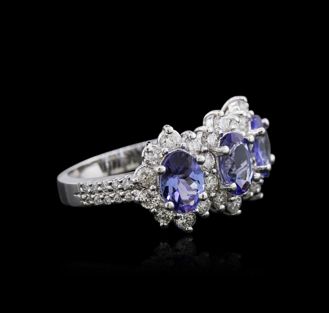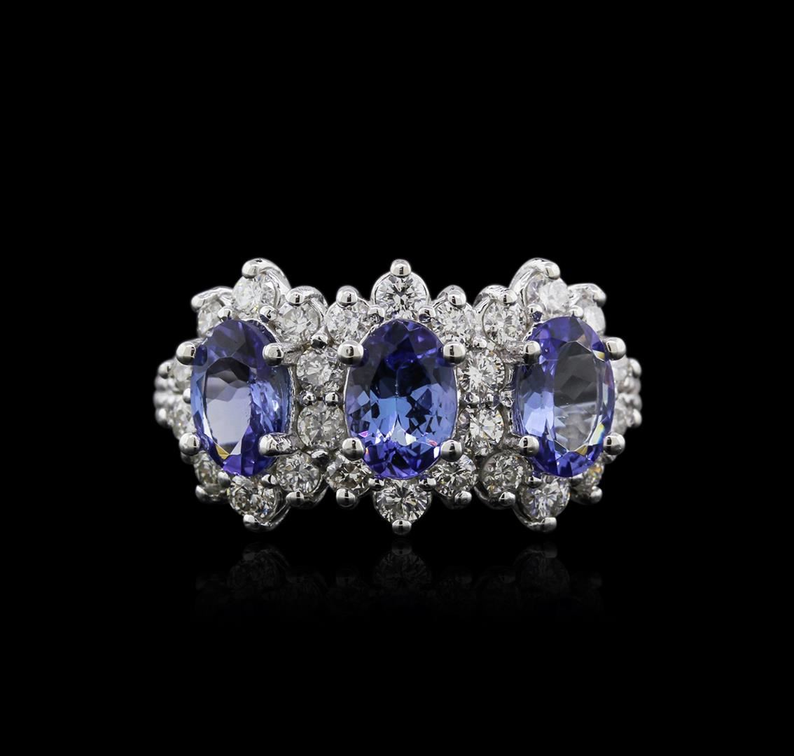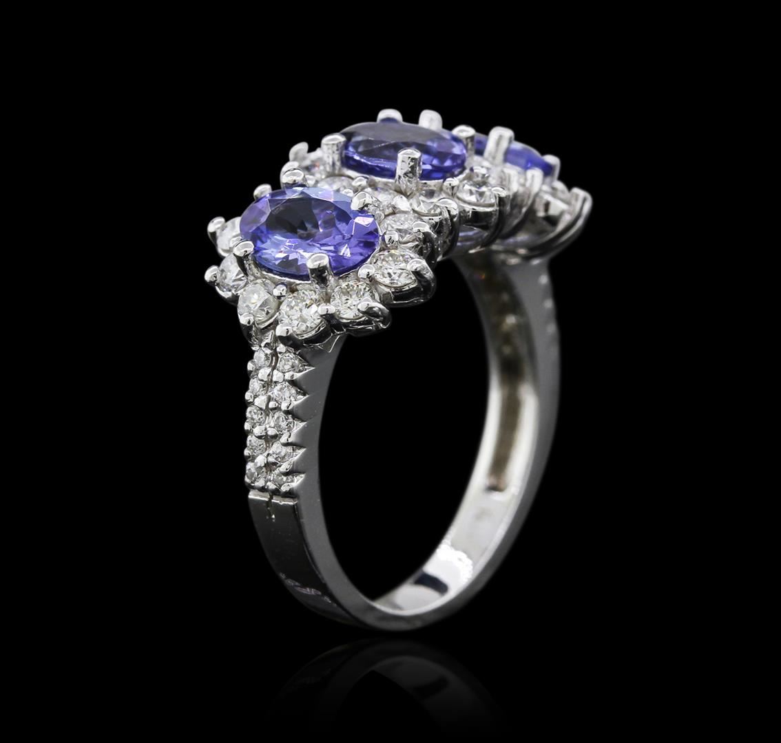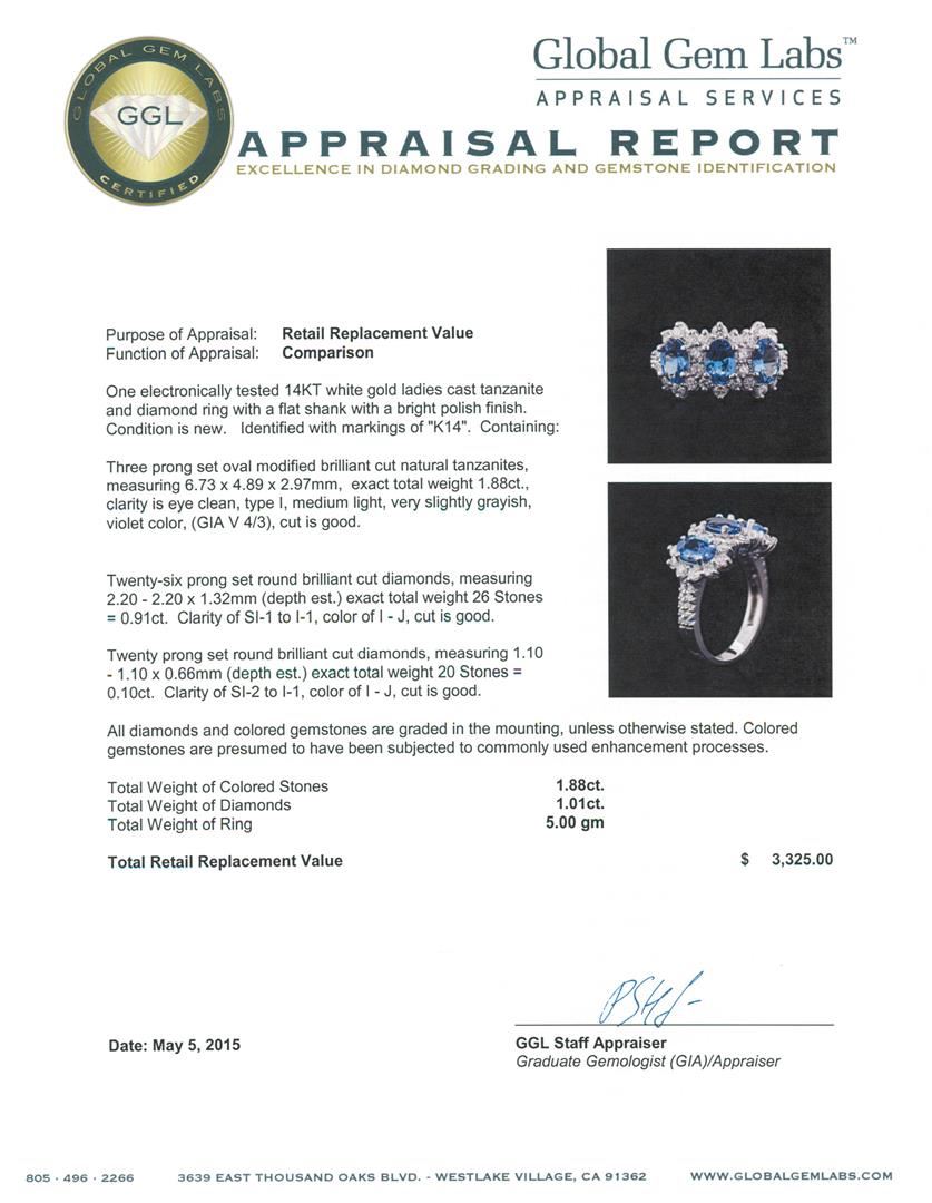 One electronically tested 14KT white gold ladies cast tanzanite and diamond ring with a flat shank with a bright polish finish. Identified with markings of "K14". Condition is new. Containing: Three prong set oval modified brilliant cut natural tanzanites, measuring 6.73 x 4.89 x 2.97mm, exact total weight 1.88ct., clarity is eye clean, type I, medium light, very slightly grayish, violet color, (GIA V 4/3), cut is good. Twenty-Six prong set round brilliant cut diamonds, measuring 2.20 - 2.20 x 1.32mm (depth est.) exact total weight 26 Stones = 0.91ct. Clarity: SI-1 to I-1. Color: I - J, Cut is Good. Twenty prong set round brilliant cut diamonds, measuring 1.10 - 1.10 x 0.66mm (depth est.) exact total weight 20 Stones = 0.10ct. Clarity: SI-2 to I-1. Color: I - J, Cut is Good. All diamonds and colored gemstones are graded in the mounting, unless otherwise stated. Colored gemstones are presumed to have been subjected to commonly used enhancement processes.. Total Weight of Colored Stones 1.88ct. Total Weight of Diamonds 1.01ct. Total Weight of Ring 5.00 grams. GGL Appraised at $3,325.00.