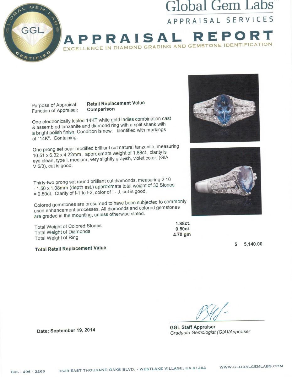 One electronically tested 14KT white gold ladies combination cast & assembled tanzanite and diamond ring with a split shank with a bright polish finish. Identified with markings of "14K". Condition is new. Containing: One prong set pear modified brilliant cut natural tanzanite, measuring 10.51 x 6.32 x 4.22mm, approximate weight of 1.88ct., clarity is eye clean, type I, medium, very slightly grayish, violet color, (GIA V 5/3), cut is good. Thirty-Two prong set round brilliant cut diamonds, measuring 2.10 - 1.50 x 1.08mm (depth est.) approximate total weight of 32 Stones = 0.50ct. Clarity: I-1 to I-2. Color: I - J, Cut is Good. Colored gemstones are presumed to have been subjected to commonly used enhancement processes. All diamonds and colored gemstones are graded in the mounting, unless otherwise stated. Total Weight of Colored Stones 1.88ct. Total Weight of Diamonds 0.50ct. Total Weight of Ring 4.70 grams. GGL Appraised at $5,140.00.