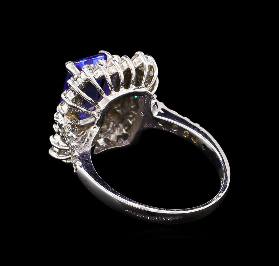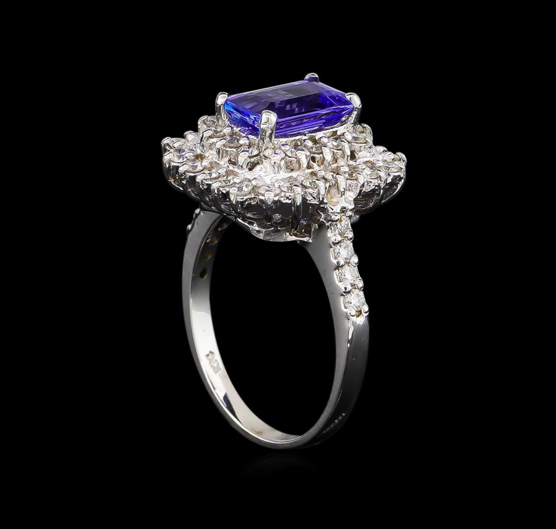 One electronically tested 14KT white gold ladies cast tanzanite and diamond ring with a bright polish finish. The featured tanzanite is set within two tiered diamond bezels supported by diamond set shoulders, completed by two millimeter wide band. Identified with markings of "K14". Condition is new, good workmanship. Containing: One prong set rectangular step cut natural tanzanite, measuring 8.70 x 6.10 x 3.70mm, approximate weight of 1.88ct., clarity is slightly included, type I, medium dark, very slightly grayish, bluish violet color, (GIA bV 6/3), cut is good. Transmitting light with no distortion, transparent. Graded in the setting.Tanzanite is a very rare gemstone that is only found in the country of Tanzania. Originally discovered in 1967. Tiffany & Company, named the stone Tanzanite. It is found in the Usumburu Mountains that border the Umba Valley of northern Tanzania. Tanzanite occurs in gray, brown, violet, blue, reddish-purple, & green. The gem is interesting because of its exceptional pleochroism. Rotated in different directions a tanzanite will exhibit multiple changes of color. Tanzanite has a low tolerance to ultrasonic cleaning, and should not be cleaned using this method.Forty-Eight prong set round brilliant cut diamonds, measuring 1.70 - 1.70 x 1.02mm (depth est.) approximate. Total Weight of 48 Stones = 0.89ct. Graded in the setting. Clarity: SI-1 to I-1 . Color: G - I. Total Weight of Colored Stones 1.88ct. Total Weight of Diamonds 0.89ct. Total Weight of Ring 6.01gm. AIG Appraised at $7,455.00.