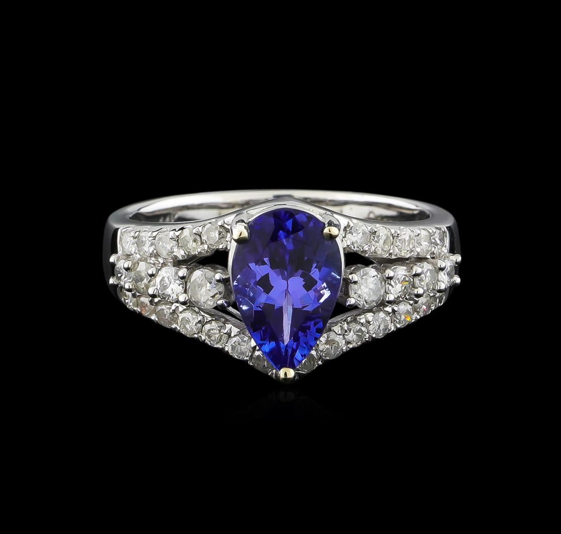 One electronically tested 14KT white gold ladies combination cast & assembled tanzanite and diamond ring with a split shank with a bright polish finish. Identified with markings of "14K". Condition is new. Containing: One prong set pear modified brilliant cut natural tanzanite, measuring 10.51 x 6.32 x 4.22mm, approximate weight of 1.88ct., clarity is eye clean, type I, medium, very slightly grayish, violet color, (GIA V 5/3), cut is good. Thirty-Two prong set round brilliant cut diamonds, measuring 2.10 - 1.50 x 1.08mm (depth est.) approximate total weight of 32 Stones = 0.50ct. Clarity: I-1 to I-2. Color: I - J, Cut is Good. Colored gemstones are presumed to have been subjected to commonly used enhancement processes. All diamonds and colored gemstones are graded in the mounting, unless otherwise stated. Total Weight of Colored Stones 1.88ct. Total Weight of Diamonds 0.50ct. Total Weight of Ring 4.70 grams. GGL Appraised at $5,140.00.