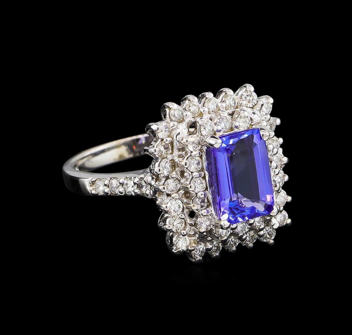 One electronically tested 14KT white gold ladies cast tanzanite and diamond ring with a bright polish finish. The featured tanzanite is set within two tiered diamond bezels supported by diamond set shoulders, completed by two millimeter wide band. Identified with markings of "K14". Condition is new, good workmanship. Containing: One prong set rectangular step cut natural tanzanite, measuring 8.70 x 6.10 x 3.70mm, approximate weight of 1.88ct., clarity is slightly included, type I, medium dark, very slightly grayish, bluish violet color, (GIA bV 6/3), cut is good. Transmitting light with no distortion, transparent. Graded in the setting.Tanzanite is a very rare gemstone that is only found in the country of Tanzania. Originally discovered in 1967. Tiffany & Company, named the stone Tanzanite. It is found in the Usumburu Mountains that border the Umba Valley of northern Tanzania. Tanzanite occurs in gray, brown, violet, blue, reddish-purple, & green. The gem is interesting because of its exceptional pleochroism. Rotated in different directions a tanzanite will exhibit multiple changes of color. Tanzanite has a low tolerance to ultrasonic cleaning, and should not be cleaned using this method.Forty-Eight prong set round brilliant cut diamonds, measuring 1.70 - 1.70 x 1.02mm (depth est.) approximate. Total Weight of 48 Stones = 0.89ct. Graded in the setting. Clarity: SI-1 to I-1 . Color: G - I. Total Weight of Colored Stones 1.88ct. Total Weight of Diamonds 0.89ct. Total Weight of Ring 6.01gm. AIG Appraised at $7,455.00.