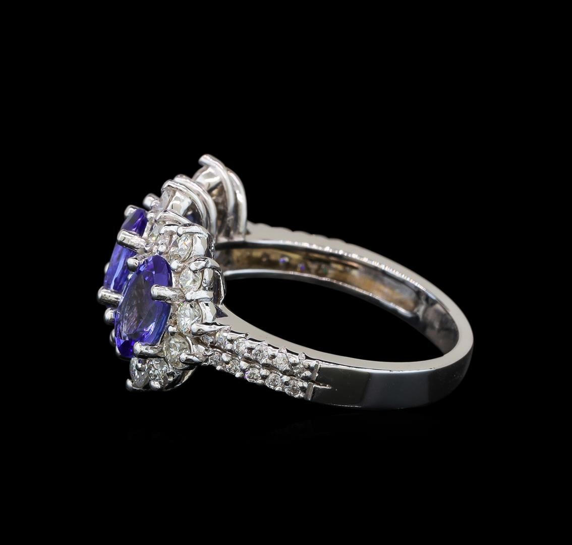 One electronically tested 14KT white gold ladies cast tanzanite and diamond ring with a flat shank with a bright polish finish. Identified with markings of "K14". Condition is new. Containing: Three prong set oval modified brilliant cut natural tanzanites, measuring 6.73 x 4.89 x 2.97mm, exact total weight 1.88ct., clarity is eye clean, type I, medium light, very slightly grayish, violet color, (GIA V 4/3), cut is good. Twenty-Six prong set round brilliant cut diamonds, measuring 2.20 - 2.20 x 1.32mm (depth est.) exact total weight 26 Stones = 0.91ct. Clarity: SI-1 to I-1. Color: I - J, Cut is Good. Twenty prong set round brilliant cut diamonds, measuring 1.10 - 1.10 x 0.66mm (depth est.) exact total weight 20 Stones = 0.10ct. Clarity: SI-2 to I-1. Color: I - J, Cut is Good. All diamonds and colored gemstones are graded in the mounting, unless otherwise stated. Colored gemstones are presumed to have been subjected to commonly used enhancement processes.. Total Weight of Colored Stones 1.88ct. Total Weight of Diamonds 1.01ct. Total Weight of Ring 5.00 grams. GGL Appraised at $3,325.00.