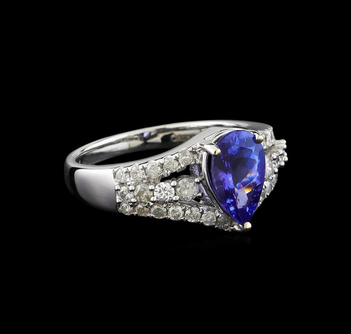 One electronically tested 14KT white gold ladies combination cast & assembled tanzanite and diamond ring with a split shank with a bright polish finish. Identified with markings of "14K". Condition is new. Containing: One prong set pear modified brilliant cut natural tanzanite, measuring 10.51 x 6.32 x 4.22mm, approximate weight of 1.88ct., clarity is eye clean, type I, medium, very slightly grayish, violet color, (GIA V 5/3), cut is good. Thirty-Two prong set round brilliant cut diamonds, measuring 2.10 - 1.50 x 1.08mm (depth est.) approximate total weight of 32 Stones = 0.50ct. Clarity: I-1 to I-2. Color: I - J, Cut is Good. Colored gemstones are presumed to have been subjected to commonly used enhancement processes. All diamonds and colored gemstones are graded in the mounting, unless otherwise stated. Total Weight of Colored Stones 1.88ct. Total Weight of Diamonds 0.50ct. Total Weight of Ring 4.70 grams. GGL Appraised at $5,140.00.