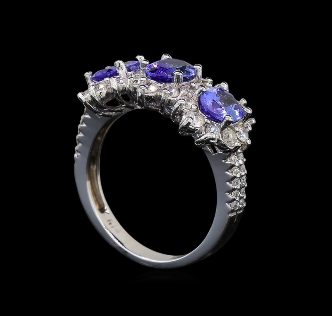 One electronically tested 14KT white gold ladies cast tanzanite and diamond ring with a flat shank with a bright polish finish. Identified with markings of "K14". Condition is new. Containing: Three prong set oval modified brilliant cut natural tanzanites, measuring 6.73 x 4.89 x 2.97mm, exact total weight 1.88ct., clarity is eye clean, type I, medium light, very slightly grayish, violet color, (GIA V 4/3), cut is good. Twenty-Six prong set round brilliant cut diamonds, measuring 2.20 - 2.20 x 1.32mm (depth est.) exact total weight 26 Stones = 0.91ct. Clarity: SI-1 to I-1. Color: I - J, Cut is Good. Twenty prong set round brilliant cut diamonds, measuring 1.10 - 1.10 x 0.66mm (depth est.) exact total weight 20 Stones = 0.10ct. Clarity: SI-2 to I-1. Color: I - J, Cut is Good. All diamonds and colored gemstones are graded in the mounting, unless otherwise stated. Colored gemstones are presumed to have been subjected to commonly used enhancement processes.. Total Weight of Colored Stones 1.88ct. Total Weight of Diamonds 1.01ct. Total Weight of Ring 5.00 grams. GGL Appraised at $3,325.00.