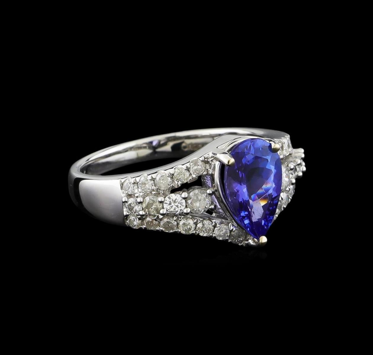 One electronically tested 14KT white gold ladies combination cast & assembled tanzanite and diamond ring with a split shank with a bright polish finish. Identified with markings of "14K". Condition is new. Containing: One prong set pear modified brilliant cut natural tanzanite, measuring 10.51 x 6.32 x 4.22mm, approximate weight of 1.88ct., clarity is eye clean, type I, medium, very slightly grayish, violet color, (GIA V 5/3), cut is good. Thirty-Two prong set round brilliant cut diamonds, measuring 2.10 - 1.50 x 1.08mm (depth est.) approximate total weight of 32 Stones = 0.50 ct. Clarity: I-1 to I-2. Color: I - J, Cut is Good. Colored gemstones are presumed to have been subjected to commonly used enhancement processes. All diamonds and colored gemstones are graded in the mounting, unless otherwise stated. Total Weight of Colored Stones 1.88ct. Total Weight of Diamonds 0.50 ct. Total Weight of Ring 4.70 grams. GGL Appraised.