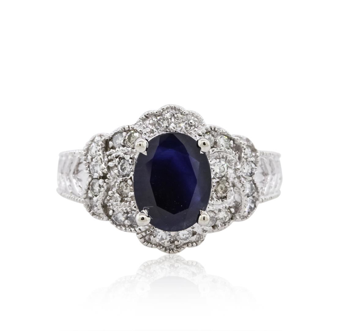 One ring featuring: 14KT white gold weighing 7.40 grams containing one prong set oval cut sapphire with a total weight of 1.88ct and pave set round cut diamonds with a total weight of 0.39cts.