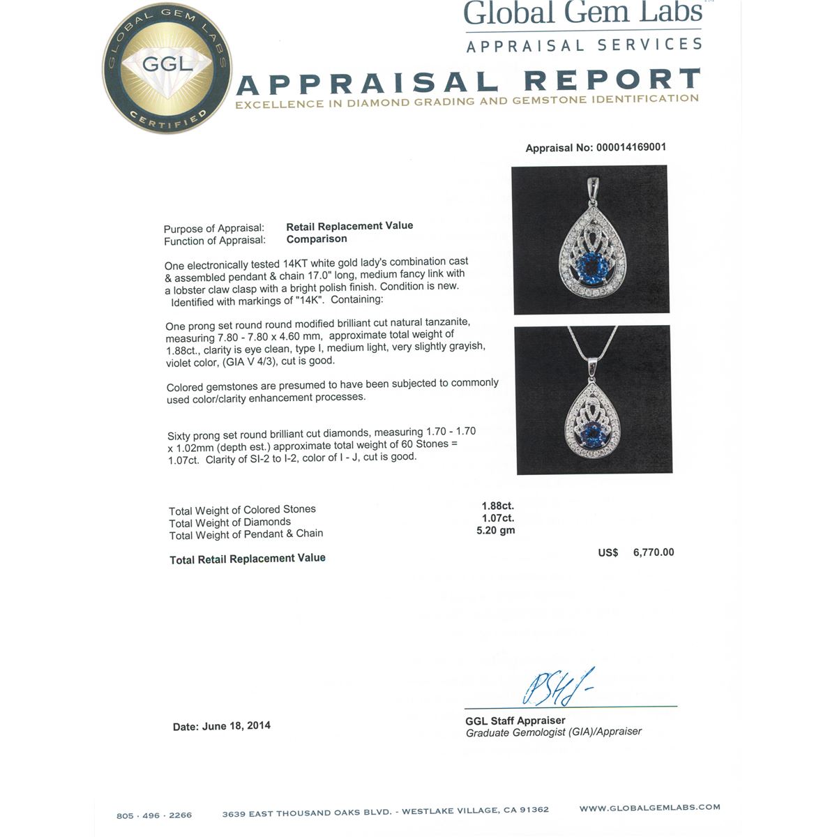 One electronically tested 14KT white gold Ladies combination cast & assembled pendant & chain 17.0" long, medium fancy link with a lobster claw clasp with a bright polish finish. Condition is new. Identified with markings of "14K". Containing: One prong set round round modified brilliant cut natural tanzanite, measuring 7.80 - 7.80 x 4.60 mm, approximate. Total Weight of 1.88ct., clarity is eye clean, type I, medium light, very slightly grayish, violet color, (GIA V 4/3), cut is good. Colored gemstones are presumed to have been subjected to commonly used color/clarity enhancement processes. Sixty prong set round brilliant cut diamonds, measuring 1.70 - 1.70 x 1.02mm (depth est.) approximate. Total Weight of 60 Stones = 1.07ct. Clarity: SI-2 to I-2. Color: I - J, Cut is Good. Total Weight of Colored Stones 1.88ct. Total Weight of Diamonds 1.07ct. Total Weight of Pendant & Chain 5.20 grams. GGL Appraised at $6,770.00.