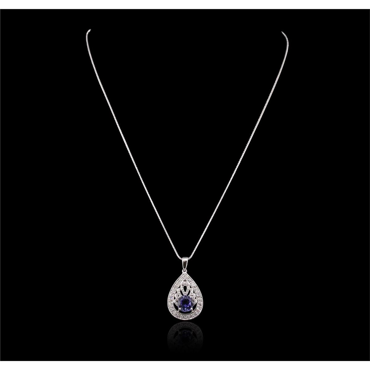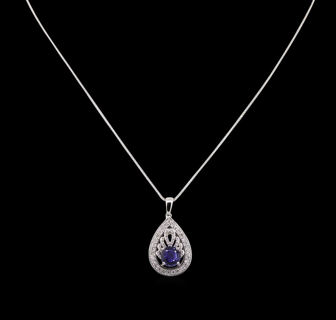 One electronically tested 14KT white gold Ladies combination cast & assembled pendant & chain 17.0" long, medium fancy link with a lobster claw clasp with a bright polish finish. Condition is new. Identified with markings of "14K". Containing: One prong set round round modified brilliant cut natural tanzanite, measuring 7.80 - 7.80 x 4.60 mm, approximate. Total Weight of 1.88ct., clarity is eye clean, type I, medium light, very slightly grayish, violet color, (GIA V 4/3), cut is good. Colored gemstones are presumed to have been subjected to commonly used color/clarity enhancement processes. Sixty prong set round brilliant cut diamonds, measuring 1.70 - 1.70 x 1.02mm (depth est.) approximate. Total Weight of 60 Stones = 1.07ct. Clarity: SI-2 to I-2. Color: I - J, Cut is Good. Total Weight of Colored Stones 1.88ct. Total Weight of Diamonds 1.07ct. Total Weight of Pendant & Chain 5.20 grams. GGL Appraised at $6,770.00.