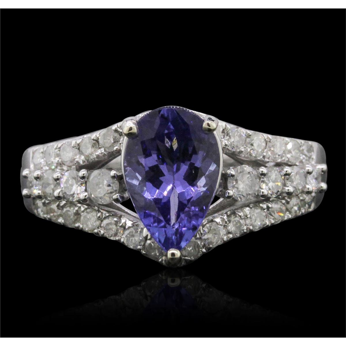 One electronically tested 14KT white gold ladies combination cast & assembled tanzanite and diamond ring with a split shank with a bright polish finish. Identified with markings of "14K". Condition is new. Containing: One prong set pear modified brilliant cut natural tanzanite, measuring 10.51 x 6.32 x 4.22mm, approximate weight of 1.88ct., clarity is eye clean, type I, medium, very slightly grayish, violet color, (GIA V 5/3), cut is good. Thirty-Two prong set round brilliant cut diamonds, measuring 2.10 - 1.50 x 1.08mm (depth est.) approximate total weight of 32 Stones = 0.50ct. Clarity: I-1 to I-2. Color: I - J, Cut is Good. Colored gemstones are presumed to have been subjected to commonly used enhancement processes. All diamonds and colored gemstones are graded in the mounting, unless otherwise stated. Total Weight of Colored Stones 1.88ct. Total Weight of Diamonds 0.50ct. Total Weight of Ring 4.70 grams. GGL Appraised at $5,140.00.