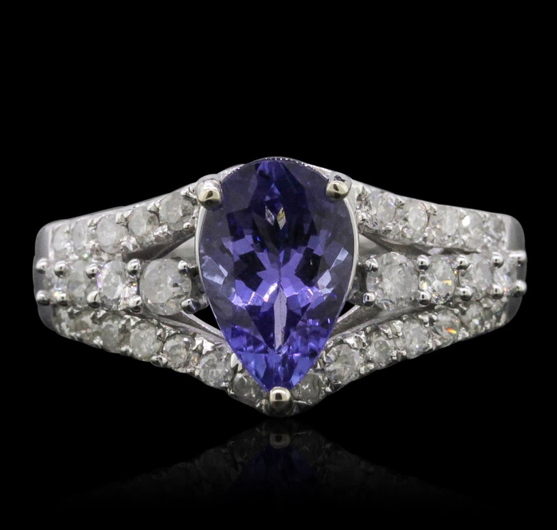 One electronically tested 14KT white gold ladies combination cast & assembled tanzanite and diamond ring with a split shank with a bright polish finish. Identified with markings of "14K". Condition is new. Containing: One prong set pear modified brilliant cut natural tanzanite, measuring 10.51 x 6.32 x 4.22mm, approximate weight of 1.88ct., clarity is eye clean, type I, medium, very slightly grayish, violet color, (GIA V 5/3), cut is good. Thirty-Two prong set round brilliant cut diamonds, measuring 2.10 - 1.50 x 1.08mm (depth est.) approximate total weight of 32 Stones = 0.50ct. Clarity: I-1 to I-2. Color: I - J, Cut is Good. Colored gemstones are presumed to have been subjected to commonly used enhancement processes. All diamonds and colored gemstones are graded in the mounting, unless otherwise stated. Total Weight of Colored Stones 1.88ct. Total Weight of Diamonds 0.50ct. Total Weight of Ring 4.70 grams. GGL Appraised at $5,140.00.