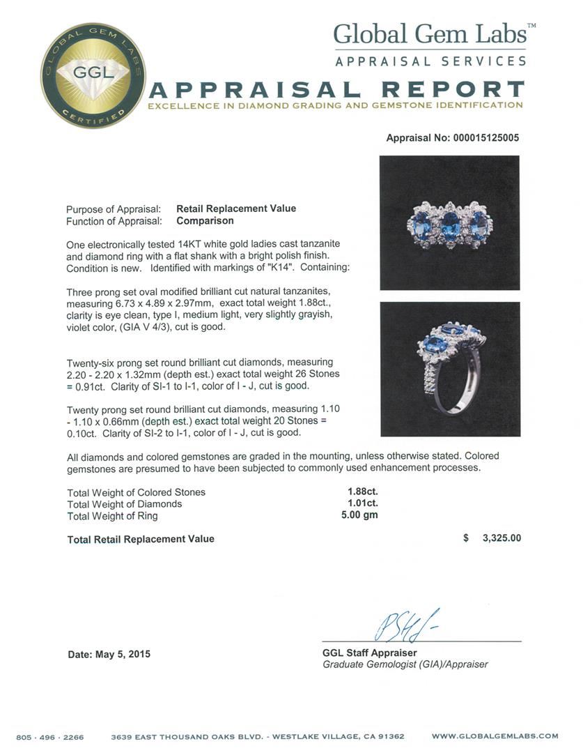 One electronically tested 14KT white gold ladies cast tanzanite and diamond ring with a flat shank with a bright polish finish. Identified with markings of "K14". Condition is new. Containing: Three prong set oval modified brilliant cut natural tanzanites, measuring 6.73 x 4.89 x 2.97mm, exact total weight 1.88ct., clarity is eye clean, type I, medium light, very slightly grayish, violet color, (GIA V 4/3), cut is good. Twenty-Six prong set round brilliant cut diamonds, measuring 2.20 - 2.20 x 1.32mm (depth est.) exact total weight 26 Stones = 0.91ct. Clarity: SI-1 to I-1. Color: I - J, Cut is Good. Twenty prong set round brilliant cut diamonds, measuring 1.10 - 1.10 x 0.66mm (depth est.) exact total weight 20 Stones = 0.10ct. Clarity: SI-2 to I-1. Color: I - J, Cut is Good. All diamonds and colored gemstones are graded in the mounting, unless otherwise stated. Colored gemstones are presumed to have been subjected to commonly used enhancement processes.. Total Weight of Colored Stones 1.88ct. Total Weight of Diamonds 1.01ct. Total Weight of Ring 5.00 grams. GGL Appraised at $3,325.00.