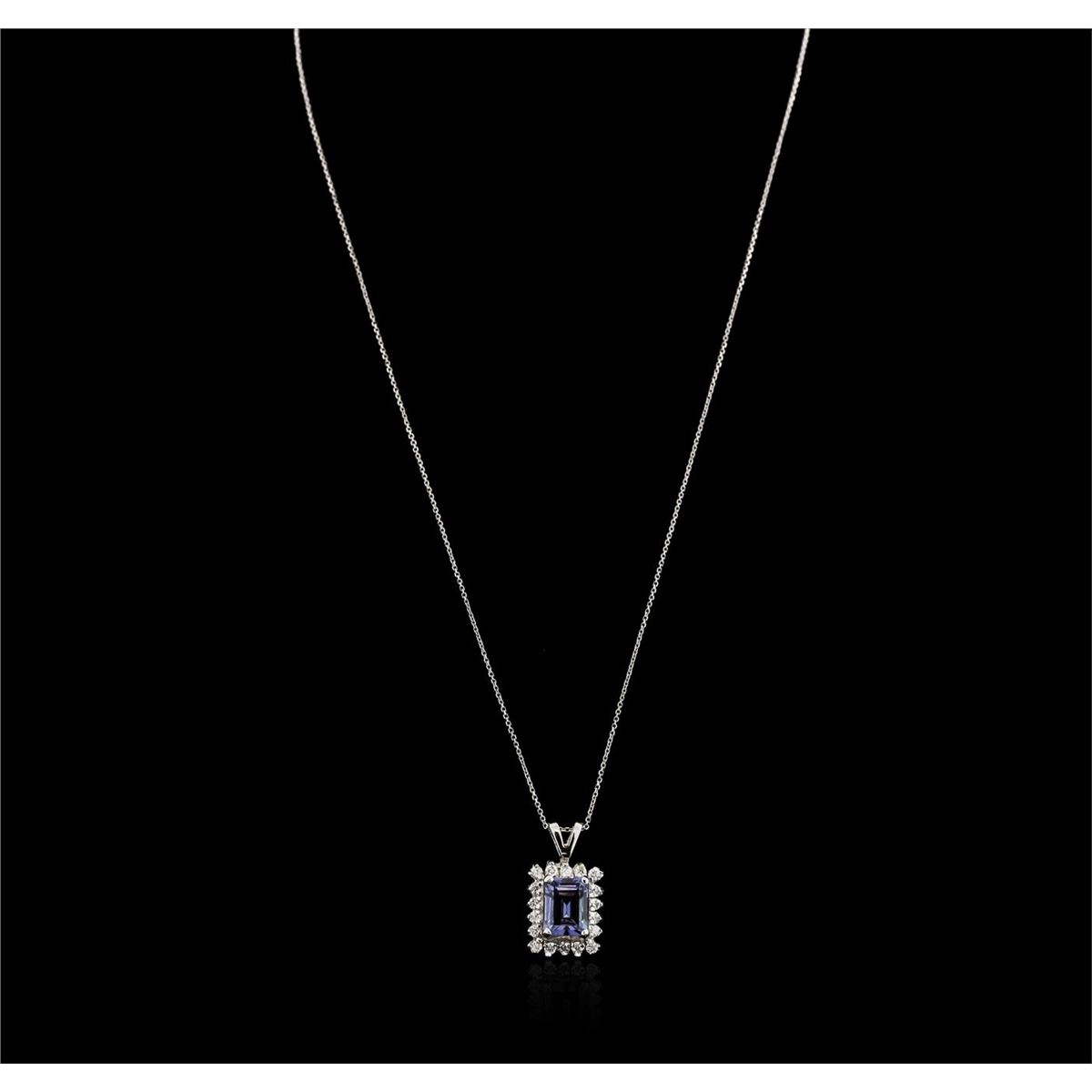 One electronically tested 14KT white gold ladies combination cast & assembled tanzanite and diamond pendant & chain 16.0" long, cable link with a spring ring clasp with a bright polish finish. Identified with markings of "14K". Condition is new. Containing: One prong set emerald standard step cut natural tanzanite, measuring 8.90 x 7.00 x 3.36mm, approximate weight of 1.89ct., clarity is eye clean, type I, medium light, slightly grayish, violet color, (GIA V 4/2), cut is good. Eighteen prong set round brilliant cut diamonds, measuring 1.50 - 1.50 x 0.90mm (depth est.) approximate total weight of 18 Stones = 0.22ct. Clarity: SI-1 to SI-2. Color: I - J, Cut is Good. Colored gemstones are presumed to have been subjected to commonly used enhancement processes. All diamonds and colored gemstones are graded in the mounting, unless otherwise stated. Total Weight of Colored Stones 1.89ct. Total Weight of Diamonds 0.22ct. Total Weight of Pendant & Chain 4.40 grams. GGL Appraised at $3,285.00.