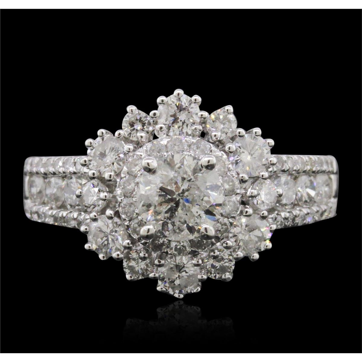 One electronically tested 14KT white gold ladies combination cast & assembled engagement ring with a split shank with a bright polish finish. Identified with markings of "14K". Condition is new. Containing: One prong set round brilliant cut diamond, measuring 5.38 - 5.37 x 3.19mm (depth est.) approximate weight of 0.56ct. Clarity: I-3. Color: K, Cut is Good. Eighteen prong set round brilliant cut diamonds, measuring 2.90 - 2.10 x 1.50mm (depth est.) approximate total weight of 18 Stones = 1.03ct. Clarity: SI-1 to I-1. Color: I - J, Cut is Good. Forty-Two prong set round brilliant cut diamonds, measuring 1.40 - 1.10 x 0.75mm (depth est.) approximate total weight of 42 Stones = 0.30ct. Clarity: SI-1 to I-1. Color: I - J, Cut is Good. All diamonds are graded in the mounting, unless otherwise stated. Total Weight of Diamonds 1.89ct. Total Weight of Ring 4.40 grams. GGL Appraised at $6,640.00.