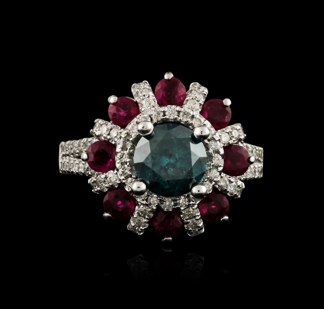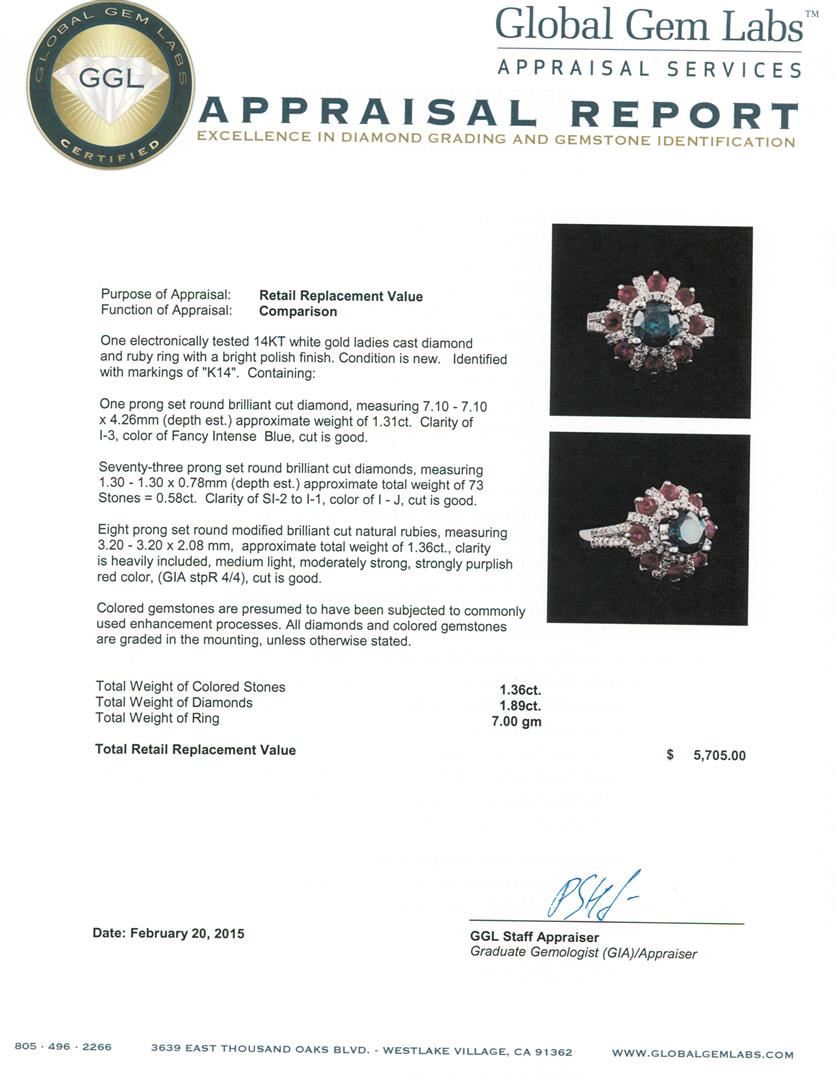 One electronically tested 14KT white gold ladies cast diamond and ruby ring with a bright polish finish. Identified with markings of "K14". Condition is new. Containing: One prong set round brilliant cut diamond, measuring 7.10 - 7.10 x 4.26mm (depth est.) approximate weight of 1.31ct. Clarity: I-3, Cut is Good. Seventy-Three prong set round brilliant cut diamonds, measuring 1.30 - 1.30 x 0.78mm (depth est.) approximate total weight of 73 Stones = 0.58ct. Clarity: SI-2 to I-1. Color: I - J, Cut is Good. Eight prong set round modified brilliant cut natural rubies, measuring 3.20 - 3.20 x 2.08 mm, approximate total weight of 1.36ct., clarity is heavily included, medium light, moderately strong, strongly purplish red color, (GIA stpR 4/4), cut is good. Colored gemstones are presumed to have been subjected to commonly used enhancement processes. All diamonds and colored gemstones are graded in the mounting, unless otherwise stated. Total Weight of Colored Stones 1.36ct. Total Weight of Diamonds 1.89ct. Total Weight of Ring 7.00 grams. GGL Appraised at $5,705.00.