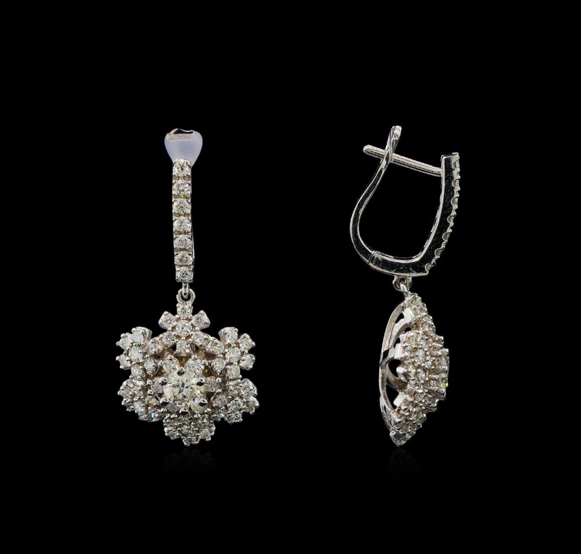 One pair electronically tested 14KT white gold ladies cast diamond earrings with hinged clip backs with a bright polish finish. Identified with markings of "14K". Condition is new. Containing: Two prong set round brilliant cut diamonds, measuring 4.20 - 4.20 x 2.52mm (depth est.) approximate total weight of 2 Stones = 0.54ct. Clarity: SI-1 to I-1. Color: J - K, Cut is Good. One Hundred Ten prong set round brilliant cut diamonds, measuring 1.50 - 1.50 x 0.90mm (depth est.) approximate total weight of 110 Stones = 1.35ct. Clarity: SI-2 to I-1. Color: I - J, Cut is Good. All diamonds are graded in the mounting, unless otherwise stated. Total Weight of Diamonds 1.90ct. Total Weight of Earrings 6.50 grams. GGL Appraised at $5,795.00.
