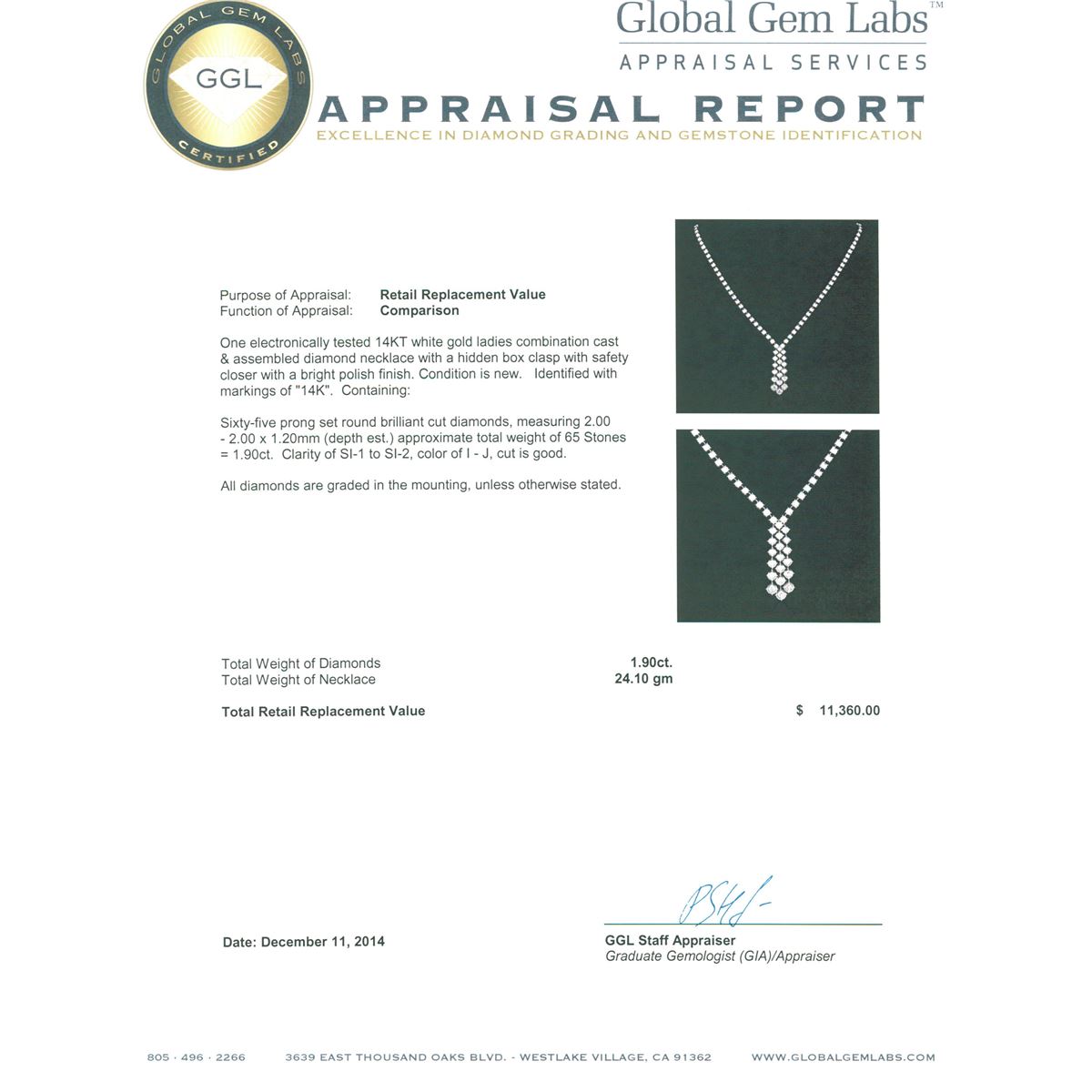 One electronically tested 14KT white gold ladies combination cast & assembled diamond necklace with a hidden box clasp with safety closer with a bright polish finish. Identified with markings of "14K". Condition is new. Containing: Sixty-Five prong set round brilliant cut diamonds, measuring 2.00 - 2.00 x 1.20mm (depth est.) approximate total weight of 65 Stones = 1.90ct. Clarity: SI-1 to SI-2. Color: I - J, Cut is Good. All diamonds are graded in the mounting, unless otherwise stated. Total Weight of Diamonds 1.90ct. Total Weight of Necklace 24.10 grams. GGL Appraised at $11,360.00.