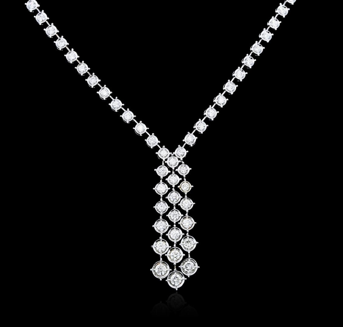 One electronically tested 14KT white gold ladies combination cast & assembled diamond necklace with a hidden box clasp with safety closer with a bright polish finish. Identified with markings of "14K". Condition is new. Containing: Sixty-Five prong set round brilliant cut diamonds, measuring 2.00 - 2.00 x 1.20mm (depth est.) approximate total weight of 65 Stones = 1.90ct. Clarity: SI-1 to SI-2. Color: I - J, Cut is Good. All diamonds are graded in the mounting, unless otherwise stated. Total Weight of Diamonds 1.90ct. Total Weight of Necklace 24.10 grams. GGL Appraised at $11,360.00.