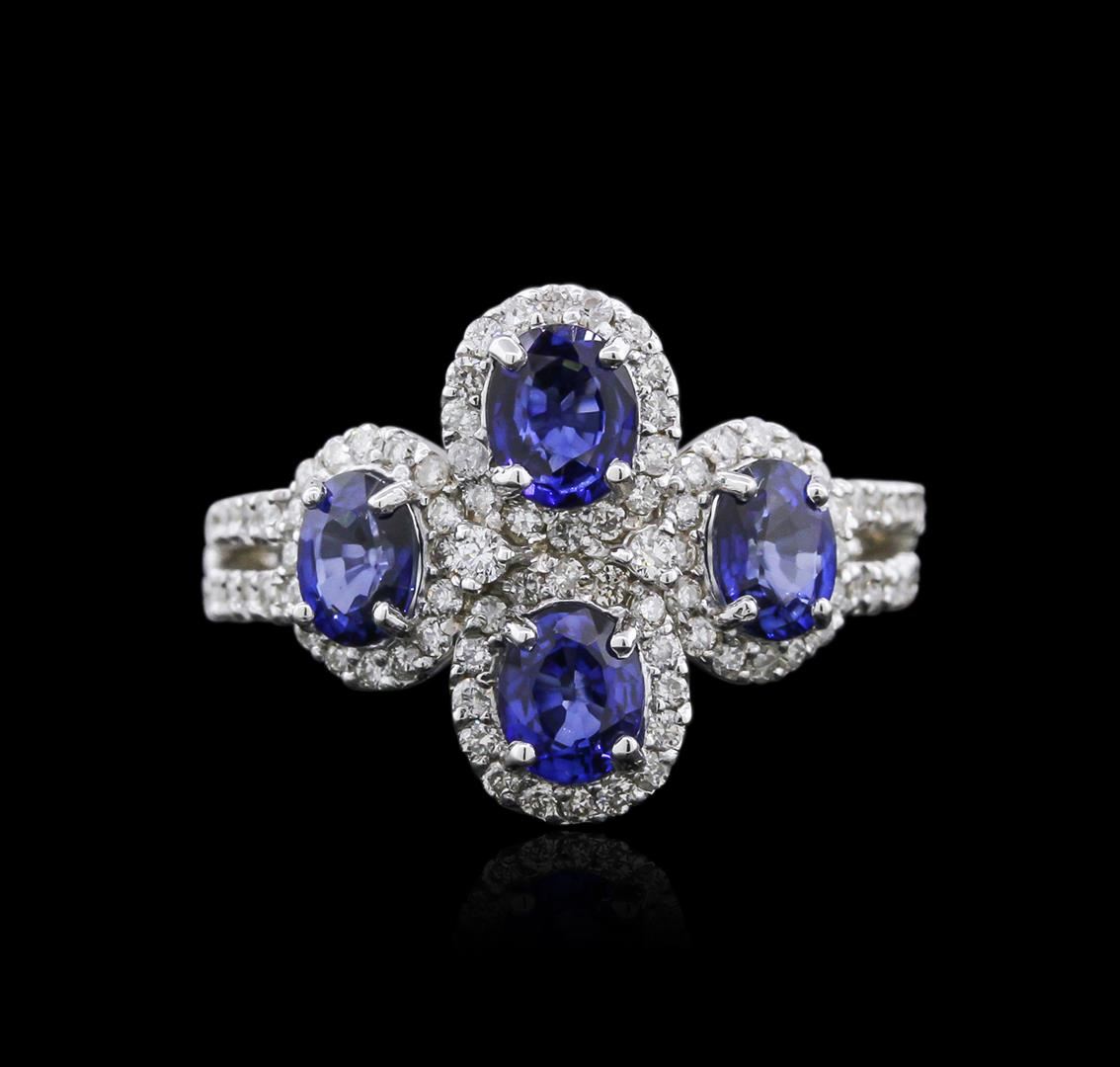 One electronically tested 14KT white gold ladies cast sapphire and diamond ring with a bright polish finish. Condition is new. Containing: Four prong set oval modified brilliant cut natural blue sapphires, measuring 5.20 x 4.20 x 2.73mm, approximate total weight of 1.90ct., clarity is eye clean, type II, medium, moderately strong, blue color, (GIA B 5/4), cut is good. Eighty-Six prong set round brilliant cut diamonds, measuring 1.30 - 1.10 x 0.72mm (depth est.) approximate total weight of 86 Stones = 0.60ct. Clarity: SI-1 to I-1. Color: I - J, Cut is Good. Colored gemstones are presumed to have been subjected to commonly used enhancement processes. All diamonds and colored gemstones are graded in the mounting, unless otherwise stated. Total Weight of Colored Stones 1.90ct. Total Weight of Diamonds 0.60ct. Total Weight of Ring 5.50 grams. GGL Appraised at $3,865.00.