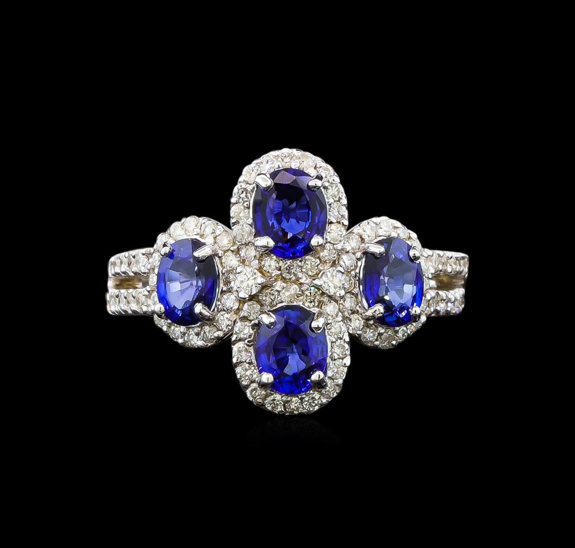 One electronically tested 14KT white gold ladies cast sapphire and diamond ring with a bright polish finish. Condition is new. Containing: Four prong set oval modified brilliant cut natural blue sapphires, measuring 5.20 x 4.20 x 2.73mm, approximate total weight of 1.90ct., clarity is eye clean, type II, medium, moderately strong, blue color, (GIA B 5/4), cut is good. Eighty-Six prong set round brilliant cut diamonds, measuring 1.30 - 1.10 x 0.72mm (depth est.) approximate total weight of 86 Stones = 0.60ct. Clarity: SI-1 to I-1. Color: I - J, Cut is Good. Colored gemstones are presumed to have been subjected to commonly used enhancement processes. All diamonds and colored gemstones are graded in the mounting, unless otherwise stated. Total Weight of Colored Stones 1.90ct. Total Weight of Diamonds 0.60ct. Total Weight of Ring 5.50 grams. GGL Appraised.