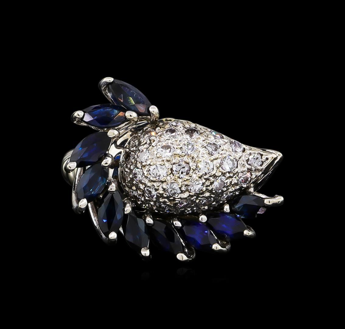 One electronically tested 14KT white gold ladies cast & assembled diamond and sapphire ring with a bright polish finish. Condition is good. The ring features a diamond set center set within a cascading sapphire bezel, supported by diagonally lobed white gold shoulders and completed by a two and one-half millimeter wide band. Containing: Ten prong set marquise mixed cut natural blue sapphires, measuring 5.30 x 2.70 x 1.76mm, approximate. Total Weight of 1.90 ct., clarity is eye clean, type II, dark, strong, violetish blue color, (GIA vB 7/5), cut is good. Transmitting light with no distortion, transparent. Partial color zoning present. Measurements & the color grade are an average for the group. Graded in the setting. Thirty-One pav, set round brilliant cut diamonds, measuring 2.00 - 1.80 x 1.14mm (depth est.) approximate. Total Weight of 31 Stones = 0.81ct. Faint brown secondary color throughout. Graded in the setting. Clarity: SI-1 to SI-2. Color: J - L. Total Weight of Colored Stones 1.90 ct. Total Weight of Diamonds 0.81ct. Total Weight of Ring 9.60 grams. AIG Appraised.