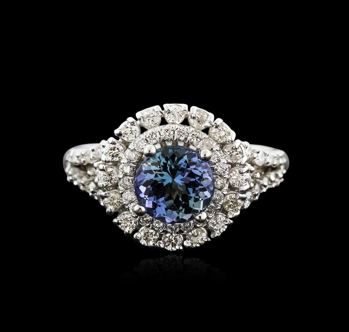 One electronically tested 14KT white gold ladies cast tanzanite and diamond ring with a bright polish finish. Identified with markings of "14K". Condition is new. Containing: One prong set round modified brilliant cut natural tanzanite, measuring 7.00 - 6.90 x 5.80 mm, approximate weight of 1.90ct., clarity is eye clean, type I, medium light, very slightly grayish, violet color, (GIA V 4/3), cut is good. Fifty-Seven prong set round brilliant cut diamonds, measuring 2.00 - 1.30 x 0.99mm (depth est.) approximate total weight of 57 Stones = 0.70ct. Clarity: SI-1 to SI-2. Color: I - J, Cut is Good. Colored gemstones are presumed to have been subjected to commonly used enhancement processes. All diamonds and colored gemstones are graded in the mounting, unless otherwise stated. Total Weight of Colored Stones 1.90ct. Total Weight of Diamonds 0.70ct. Total Weight of Ring 4.30 grams. GGL Appraised at $3,420.00.