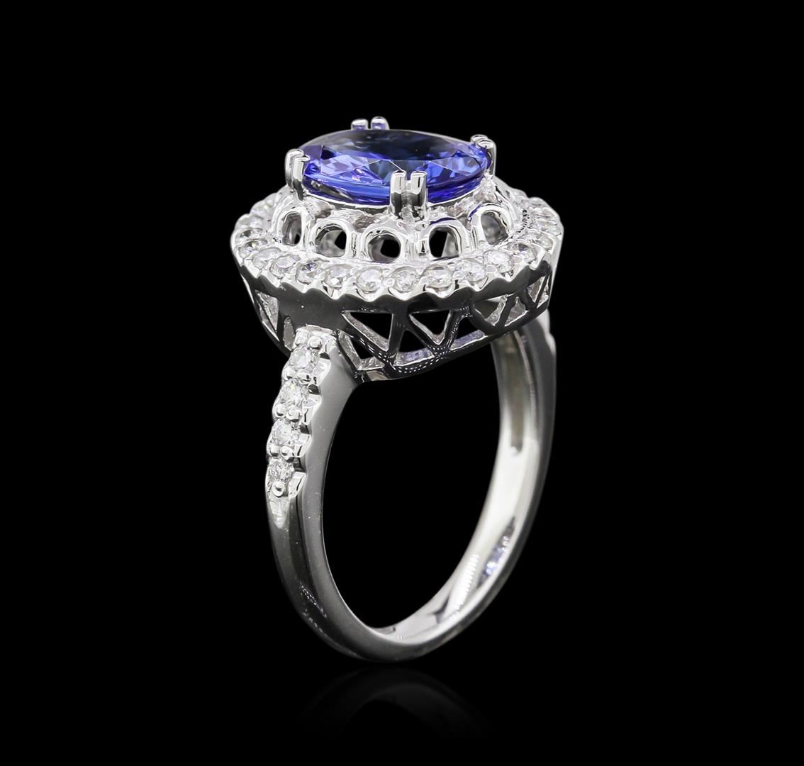 One electronically tested 14KT white gold ladies cast tanzanite and diamond ring with a bright polish finish. Identified with markings of "14K". Condition is new. Containing: One prong set oval modified brilliant cut natural tanzanite, measuring 10.50 x 7.30 x 4.75mm, approximate weight of 1.90ct., clarity is eye clean, type I, medium, moderately strong, violet color, (GIA V 5/4), cut is good. Thirty-Six prong set round brilliant cut diamonds, measuring 1.50 - 1.50 x 0.90mm (depth est.) approximate total weight of 36 Stones = 0.52ct. Clarity: SI-1 to SI-2. Color: I - J, Cut is Good. Colored gemstones are presumed to have been subjected to commonly used enhancement processes. All diamonds and colored gemstones are graded in the mounting, unless otherwise stated. Total Weight of Colored Stones 1.90ct. Total Weight of Diamonds 0.52ct. Total Weight of Ring 5.50 grams. GGL Appraised at $3,170.00.