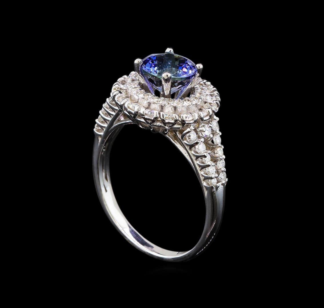 One electronically tested 14KT white gold ladies cast tanzanite and diamond ring with a bright polish finish. Identified with markings of "14K". Condition is new. Containing: One prong set round modified brilliant cut natural tanzanite, measuring 7.00 - 6.90 x 5.80 mm, approximate weight of 1.90ct., clarity is eye clean, type I, medium light, very slightly grayish, violet color, (GIA V 4/3), cut is good. Fifty-Seven prong set round brilliant cut diamonds, measuring 2.00 - 1.30 x 0.99mm (depth est.) approximate total weight of 57 Stones = 0.70ct. Clarity: SI-1 to SI-2. Color: I - J, Cut is Good. Colored gemstones are presumed to have been subjected to commonly used enhancement processes. All diamonds and colored gemstones are graded in the mounting, unless otherwise stated. Total Weight of Colored Stones 1.90ct. Total Weight of Diamonds 0.70ct. Total Weight of Ring 4.30 grams. GGL Appraised at $3,420.00.
