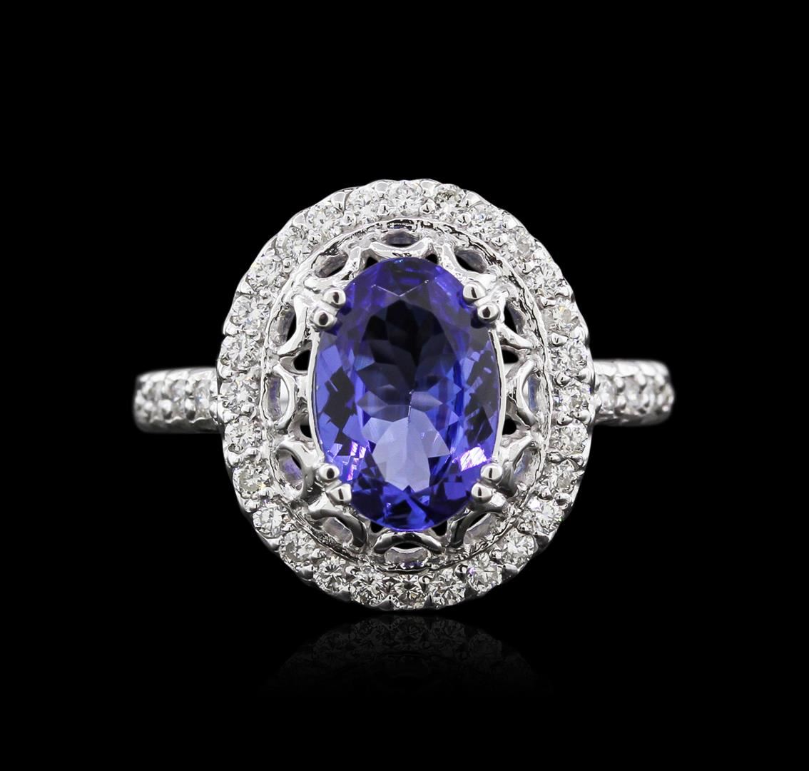 One electronically tested 14KT white gold ladies cast tanzanite and diamond ring with a bright polish finish. Identified with markings of "14K". Condition is new. Containing: One prong set oval modified brilliant cut natural tanzanite, measuring 10.50 x 7.30 x 4.75mm, approximate weight of 1.90ct., clarity is eye clean, type I, medium, moderately strong, violet color, (GIA V 5/4), cut is good. Thirty-Six prong set round brilliant cut diamonds, measuring 1.50 - 1.50 x 0.90mm (depth est.) approximate total weight of 36 Stones = 0.52ct. Clarity: SI-1 to SI-2. Color: I - J, Cut is Good. Colored gemstones are presumed to have been subjected to commonly used enhancement processes. All diamonds and colored gemstones are graded in the mounting, unless otherwise stated. Total Weight of Colored Stones 1.90ct. Total Weight of Diamonds 0.52ct. Total Weight of Ring 5.50 grams. GGL Appraised at $3,170.00.