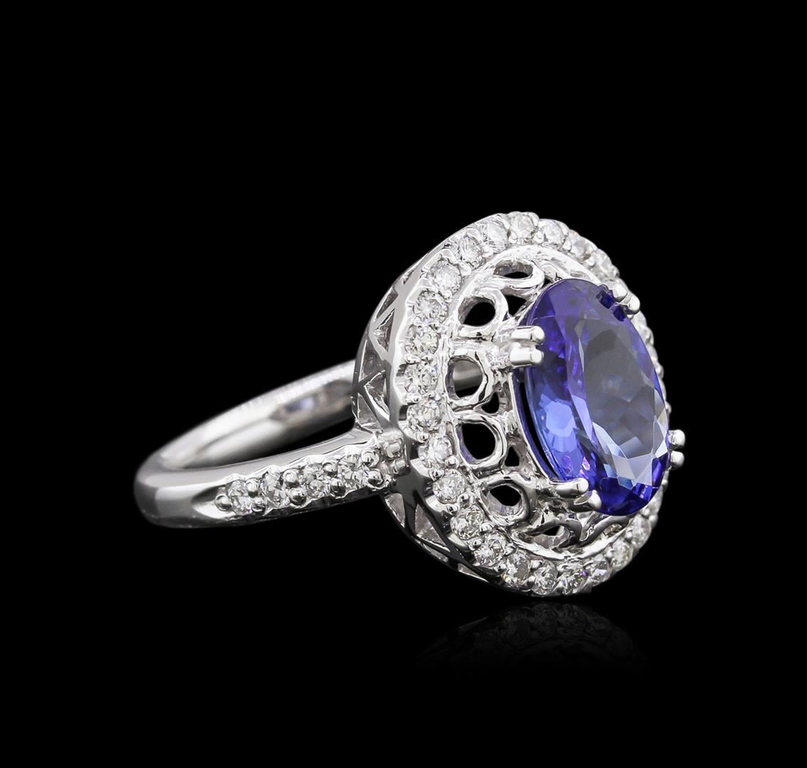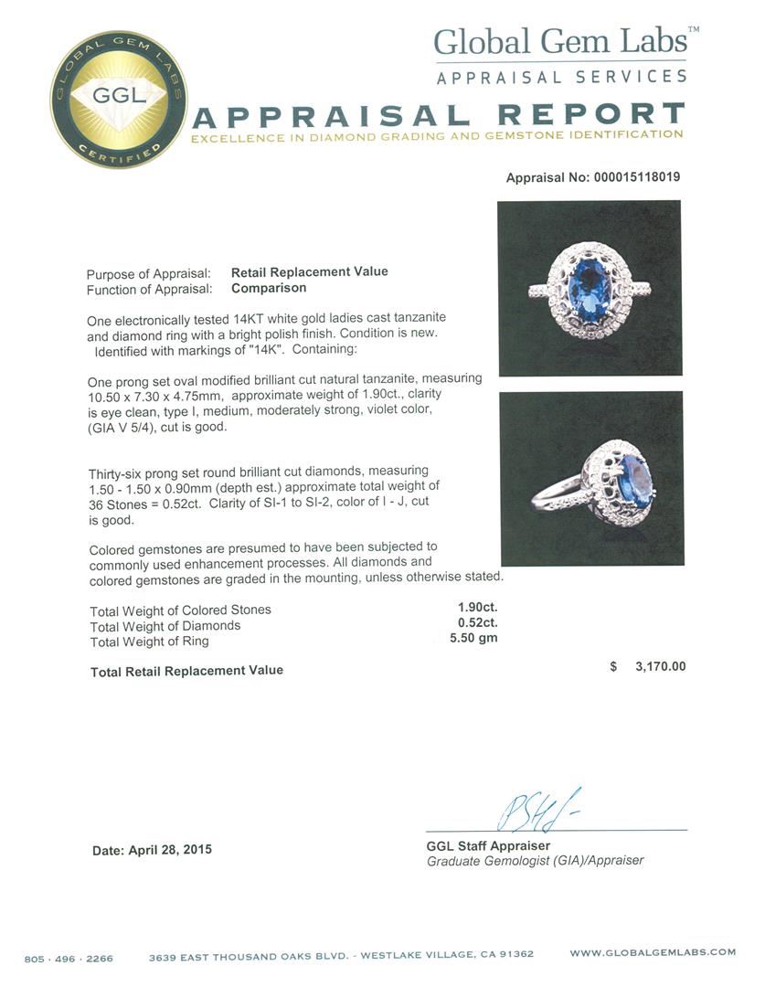One electronically tested 14KT white gold ladies cast tanzanite and diamond ring with a bright polish finish. Identified with markings of "14K". Condition is new. Containing: One prong set oval modified brilliant cut natural tanzanite, measuring 10.50 x 7.30 x 4.75mm, approximate weight of 1.90ct., clarity is eye clean, type I, medium, moderately strong, violet color, (GIA V 5/4), cut is good. Thirty-Six prong set round brilliant cut diamonds, measuring 1.50 - 1.50 x 0.90mm (depth est.) approximate total weight of 36 Stones = 0.52ct. Clarity: SI-1 to SI-2. Color: I - J, Cut is Good. Colored gemstones are presumed to have been subjected to commonly used enhancement processes. All diamonds and colored gemstones are graded in the mounting, unless otherwise stated. Total Weight of Colored Stones 1.90ct. Total Weight of Diamonds 0.52ct. Total Weight of Ring 5.50 grams. GGL Appraised at $3,170.00.