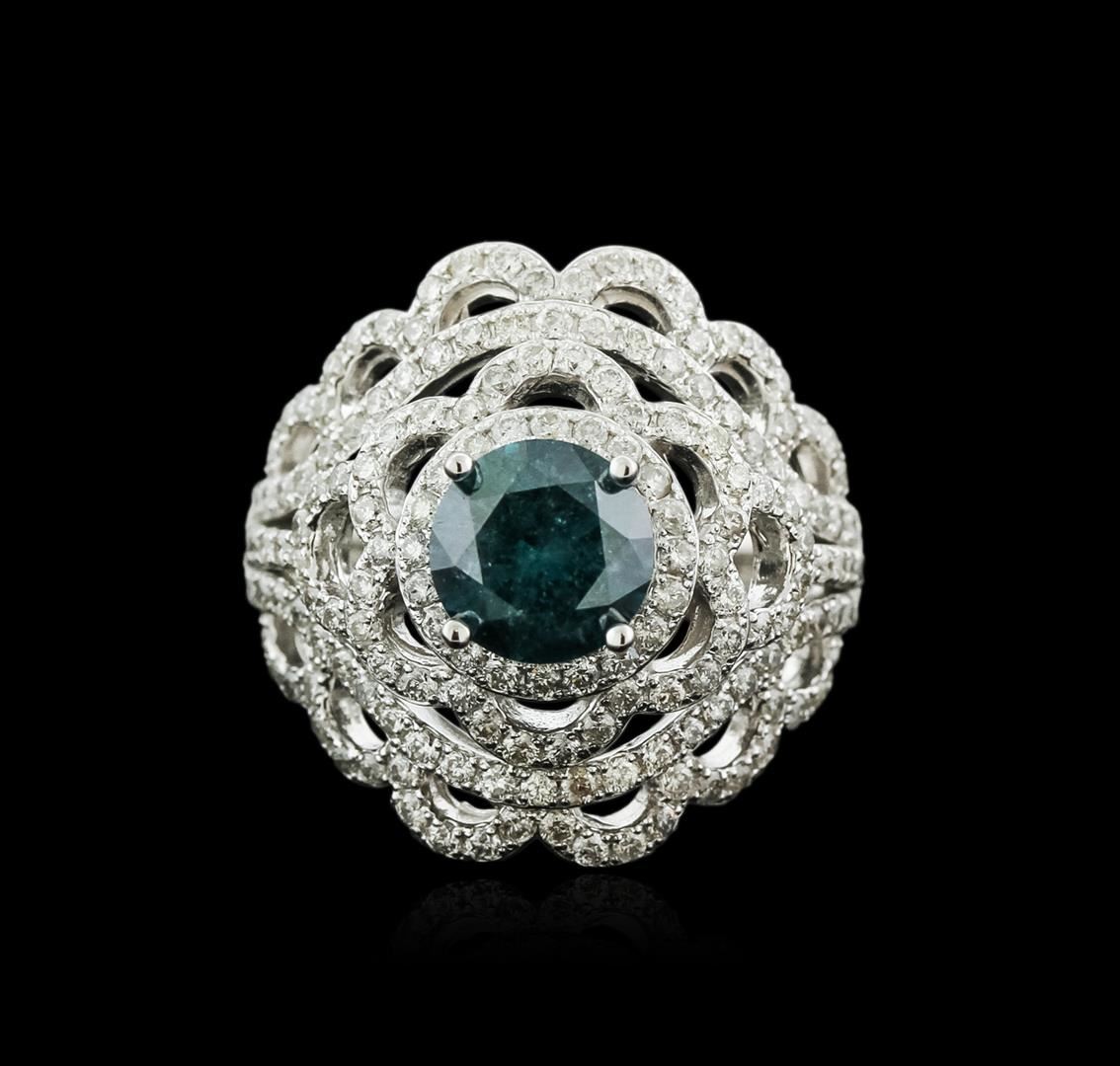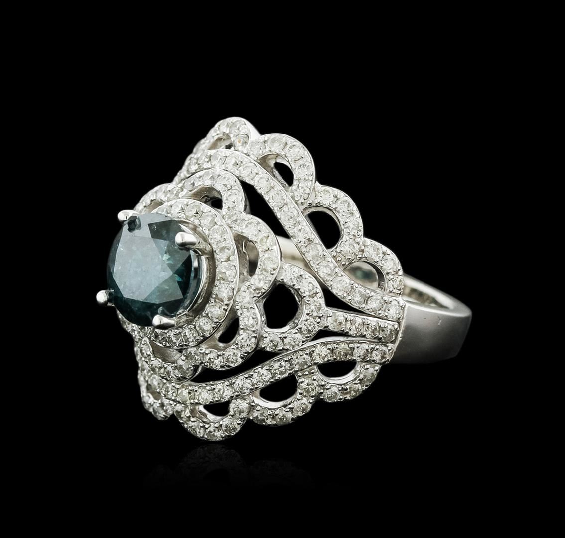 One electronically tested 14KT white gold ladies cast diamond engagement ring with a bright polish finish. Identified with markings of "K14". Condition is new. Containing: One prong set round brilliant cut diamond, measuring 7.10 - 7.10 x 4.26mm (depth est.) approximate weight of 1.31ct. Clarity: I-2, Cut is Good. Color of the stone has been treated. One Hundred Sixty-Four prong set round brilliant cut diamonds, measuring 1.00 - 1.00 x 0.60mm (depth est.) approximate total weight of 164 Stones = 0.59ct. Clarity: SI-2 to I-1. Color: H - I, Cut is Good. All diamonds are graded in the mounting, unless otherwise stated. Total Weight of Diamonds 1.90ct. Total Weight of Engagement Ring 8.30 grams. GGL Appraised at $5,565.00.
