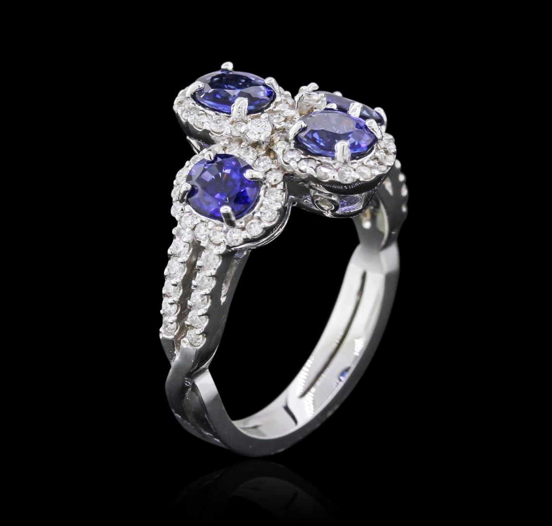 One electronically tested 14KT white gold ladies cast sapphire and diamond ring with a bright polish finish. Condition is new. Containing: Four prong set oval modified brilliant cut natural blue sapphires, measuring 5.20 x 4.20 x 2.73mm, approximate total weight of 1.90ct., clarity is eye clean, type II, medium, moderately strong, blue color, (GIA B 5/4), cut is good. Eighty-Six prong set round brilliant cut diamonds, measuring 1.30 - 1.10 x 0.72mm (depth est.) approximate total weight of 86 Stones = 0.60ct. Clarity: SI-1 to I-1. Color: I - J, Cut is Good. Colored gemstones are presumed to have been subjected to commonly used enhancement processes. All diamonds and colored gemstones are graded in the mounting, unless otherwise stated. Total Weight of Colored Stones 1.90ct. Total Weight of Diamonds 0.60ct. Total Weight of Ring 5.50 grams. GGL Appraised at $3,865.00.