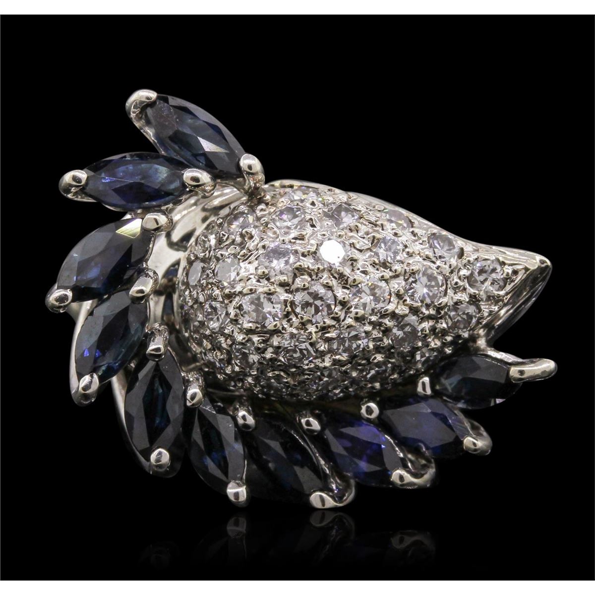 One electronically tested 14KT white gold ladies cast & assembled diamond and sapphire ring with a bright polish finish. Condition is good. The ring features a diamond set center set within a cascading sapphire bezel, supported by diagonally lobed white gold shoulders and completed by a two and one-half millimeter wide band. Containing: Ten prong set marquise mixed cut natural blue sapphires, measuring 5.30 x 2.70 x 1.76mm, approximate. Total Weight of 1.90ct., clarity is eye clean, type II, dark, strong, violetish blue color, (GIA vB 7/5), cut is good. Transmitting light with no distortion, transparent. Partial color zoning present. Measurements & the color grade are an average for the group. Graded in the setting. Thirty-One pav, set round brilliant cut diamonds, measuring 2.00 - 1.80 x 1.14mm (depth est.) approximate. Total Weight of 31 Stones = 0.81ct. Faint brown secondary color throughout. Graded in the setting. Clarity: SI-1 to SI-2. Color: J - L. Total Weight of Colored Stones 1.90ct. Total Weight of Diamonds 0.81ct. Total Weight of Ring 9.60 grams. AIG Appraised at $4,385.00.