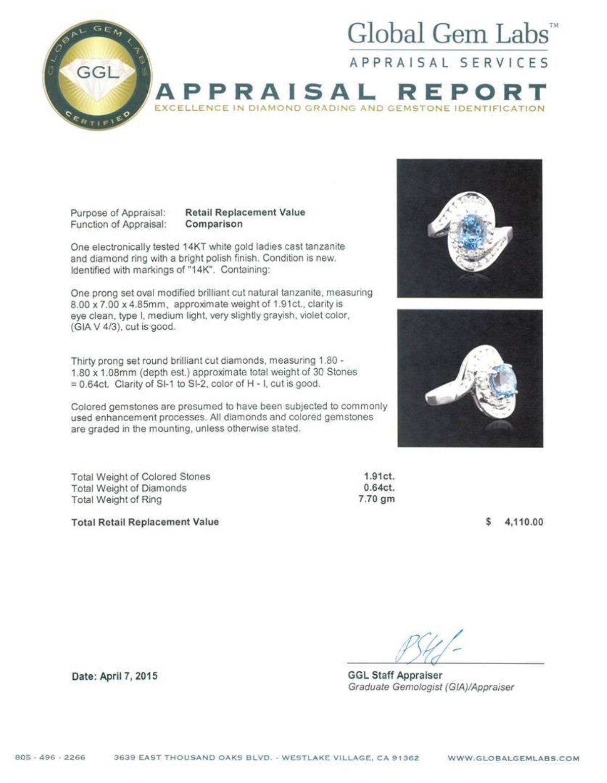 One electronically tested 14KT white gold ladies cast tanzanite and diamond ring with a bright polish finish. Identified with markings of "14K". Condition is new. Containing: One prong set oval modified brilliant cut natural tanzanite, measuring 8.00. x 7.00. x 4.85mm, approximate weight of 1.91ct., clarity is eye clean, type I, medium light, very slightly grayish, violet color, (GIA V 4/3), cut is good. Thirty prong set round brilliant cut diamonds, measuring 1.80 - 1.80 x 1.08mm (depth est.) approximate total weight of 30 Stones = 0.64ct. Clarity: SI-1 to SI-2. Color: H - I, Cut is Good. Colored gemstones are presumed to have been subjected to commonly used enhancement processes. All diamonds and colored gemstones are graded in the mounting, unless otherwise stated. Total Weight of Colored Stones 1.91ct. Total Weight of Diamonds 0.64ct. Total Weight of Ring 7.70 grams. GGL Appraised.
