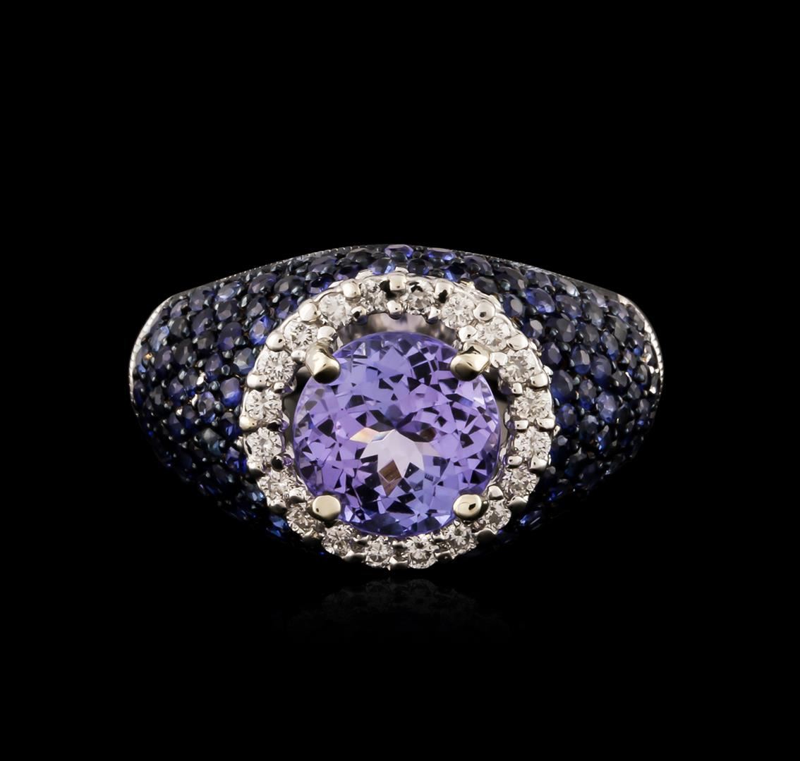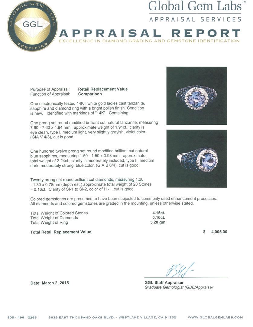 One electronically tested 14KT white gold ladies cast tanzanite, sapphire and diamond ring with a bright polish finish. Identified with markings of "14K". Condition is new. Containing: One prong set round modified brilliant cut natural tanzanite, measuring 7.60 - 7.60 x 4.94 mm, approximate weight of 1.91ct., clarity is eye clean, type I, medium light, very slightly grayish, violet color, (GIA V 4/3), cut is good. One hundred twelve prong set round modified brilliant cut natural blue sapphires, measuring 1.50 - 1.50 x 0.98 mm, approximate total weight of 2.24ct., clarity is moderately included, type II, medium dark, moderately strong, blue color, (GIA B 6/4), cut is good. Twenty prong set round brilliant cut diamonds, measuring 1.30 - 1.30 x 0.78mm (depth est.) approximate total weight of 20 Stones = 0.16ct. Clarity: SI-1 to SI-2. Color: H - I, Cut is Good. Colored gemstones are presumed to have been subjected to commonly used enhancement processes. All diamonds and colored gemstones are graded in the mounting, unless otherwise stated. Total Weight of Colored Stones 4.15ct. Total Weight of Diamonds 0.16ct. Total Weight of Ring 5.20 grams. GGL Appraised at $4,005.00.
