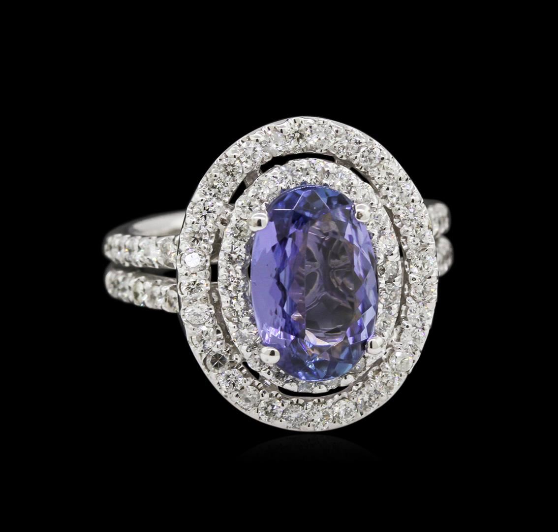 One electronically tested 14KT white gold ladies combination cast & assembled tanzanite and diamond ring with a bright polish finish. Identified with markings of "14K". Condition is new. Containing: One prong set oval modified brilliant cut natural tanzanite, measuring 11.00 x 7.20 x 3.45mm, approximate weight of 1.92ct., clarity is eye clean, type I, medium light, very slightly grayish, violet color, (GIA V 4/3), cut is good. Seventy-Nine prong set round brilliant cut diamonds, measuring 1.30 - 1.30 x 0.78mm (depth est.) approximate total weight of 79 Stones = 0.63ct. Clarity: SI-2 to I-1. Color: I - J, Cut is Good. Colored gemstones are presumed to have been subjected to commonly used enhancement processes. All diamonds and colored gemstones are graded in the mounting, unless otherwise stated. Total Weight of Colored Stones 1.92ct. Total Weight of Diamonds 0.63ct. Total Weight of Ring 7.00 grams. GGL Appraised at $4,920.00.