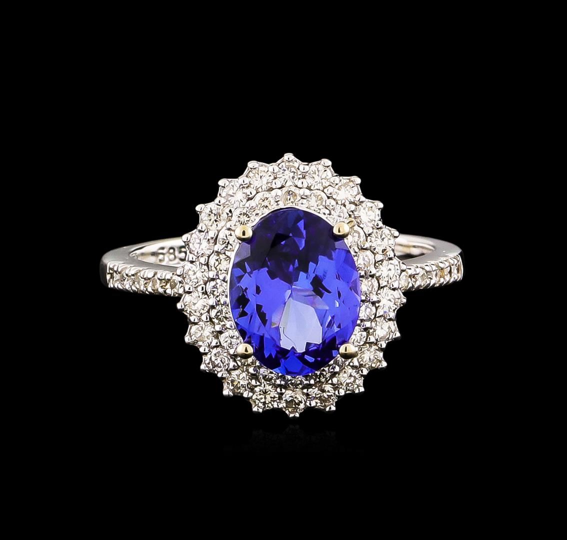 One electronically tested 14KT white gold ladies cast tanzanite and diamond ring with a bright polish finish. Condition is new, good workmanship. The featured tanzanite is set within a two tiered diamond bezel supported by diamond set shoulders, completed by a two millimeter wide band. Identified with markings of "585". Containing: One prong set oval brilliant cut natural tanzanite, measuring 9.35 x 7.10 x 4.00mm, 6%. bulge factor, approximate weight of 1.92ct., clarity is eye clean, type I, medium dark, very slightly grayish, violetish blue color, (GIA vB 6/3), cut is good. Transmitting light with no distortion, transparent. Graded in the setting. Tanzanite is a very rare gemstone that is only found in the country of Tanzania. Originally discovered in 1967. Tiffany & Company, named the stone Tanzanite. It is found in the Usumburu Mountains that border the Umba Valley of northern Tanzania. Tanzanite occurs in gray, brown, violet, blue, reddish-purple, & green. The gem is interesting because of its exceptional pleochroism. Rotated in different directions a tanzanite will exhibit multiple changes of color. Tanzanite has a low tolerance to ultrasonic cleaning, and should not be cleaned using this method. Fifty-Two prong set round brilliant cut diamonds, measuring 1.50 - 1.20 x 0.81mm (depth est.) approximate. Total Weight of 52 Stones = 0.56ct. Graded in the setting. Clarity: VS-2 to SI-2. Color: H - J. Total Weight of Colored Stones 1.92ct. Total Weight of Diamonds 0.56ct. Total Weight of Ring 4.51 grams. AIG Appraised at $6,700.00.