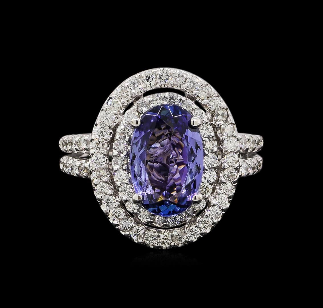 One electronically tested 14KT white gold ladies combination cast & assembled tanzanite and diamond ring with a bright polish finish. Identified with markings of "14K". Condition is new. Containing: One prong set oval modified brilliant cut natural tanzanite, measuring 11.00 x 7.20 x 3.45mm, approximate weight of 1.92ct., clarity is eye clean, type I, medium light, very slightly grayish, violet color, (GIA V 4/3), cut is good. Seventy-Nine prong set round brilliant cut diamonds, measuring 1.30 - 1.30 x 0.78mm (depth est.) approximate total weight of 79 Stones = 0.63ct. Clarity: SI-2 to I-1. Color: I - J, Cut is Good. Colored gemstones are presumed to have been subjected to commonly used enhancement processes. All diamonds and colored gemstones are graded in the mounting, unless otherwise stated. Total Weight of Colored Stones 1.92ct. Total Weight of Diamonds 0.63ct. Total Weight of Ring 7.00 grams. GGL Appraised at $4,920.00.